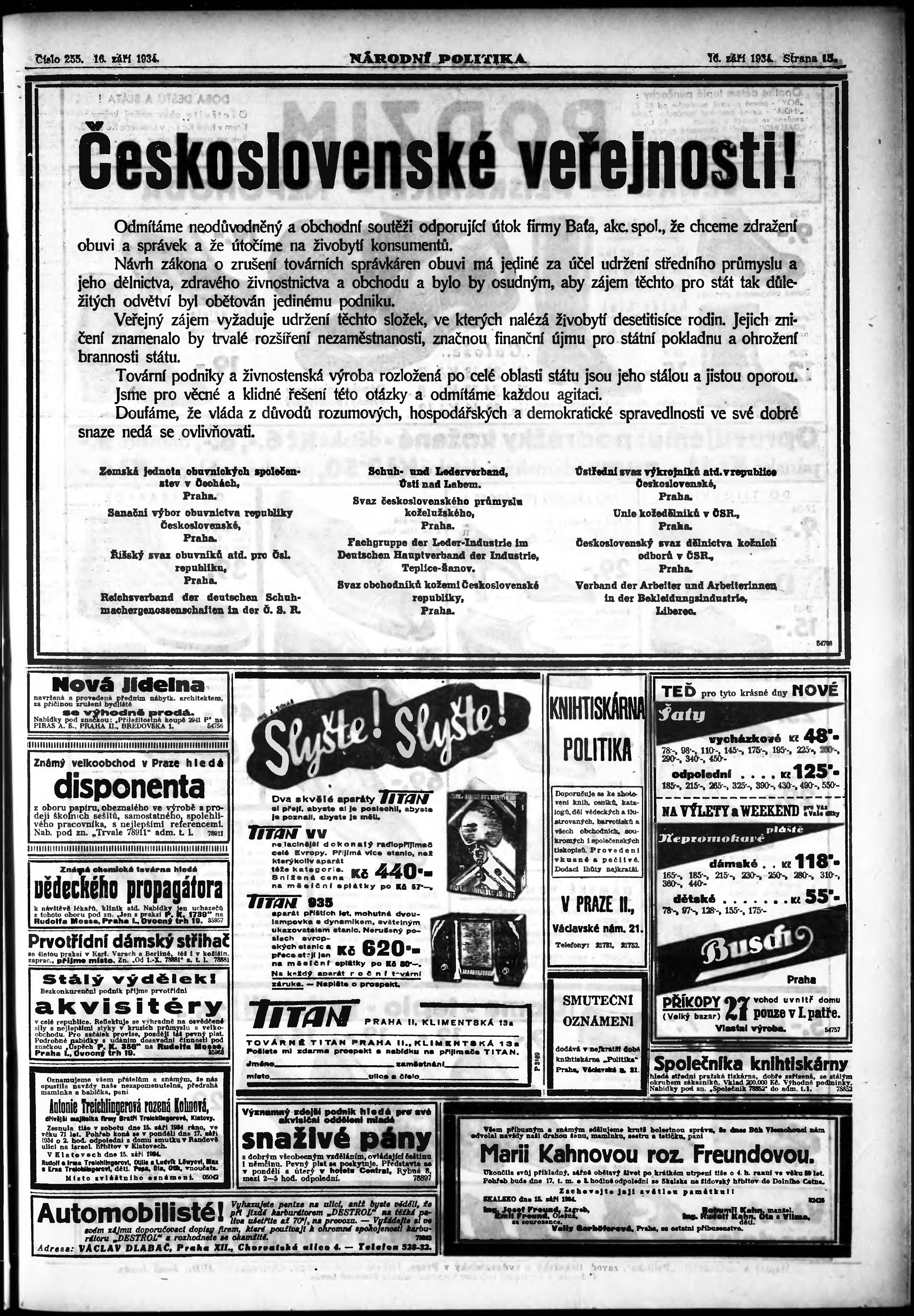 * Datum vydání výtisku: 16.9.1934 Číslo výtisku: 255 Poznámky k výtisku: ranní vydání;