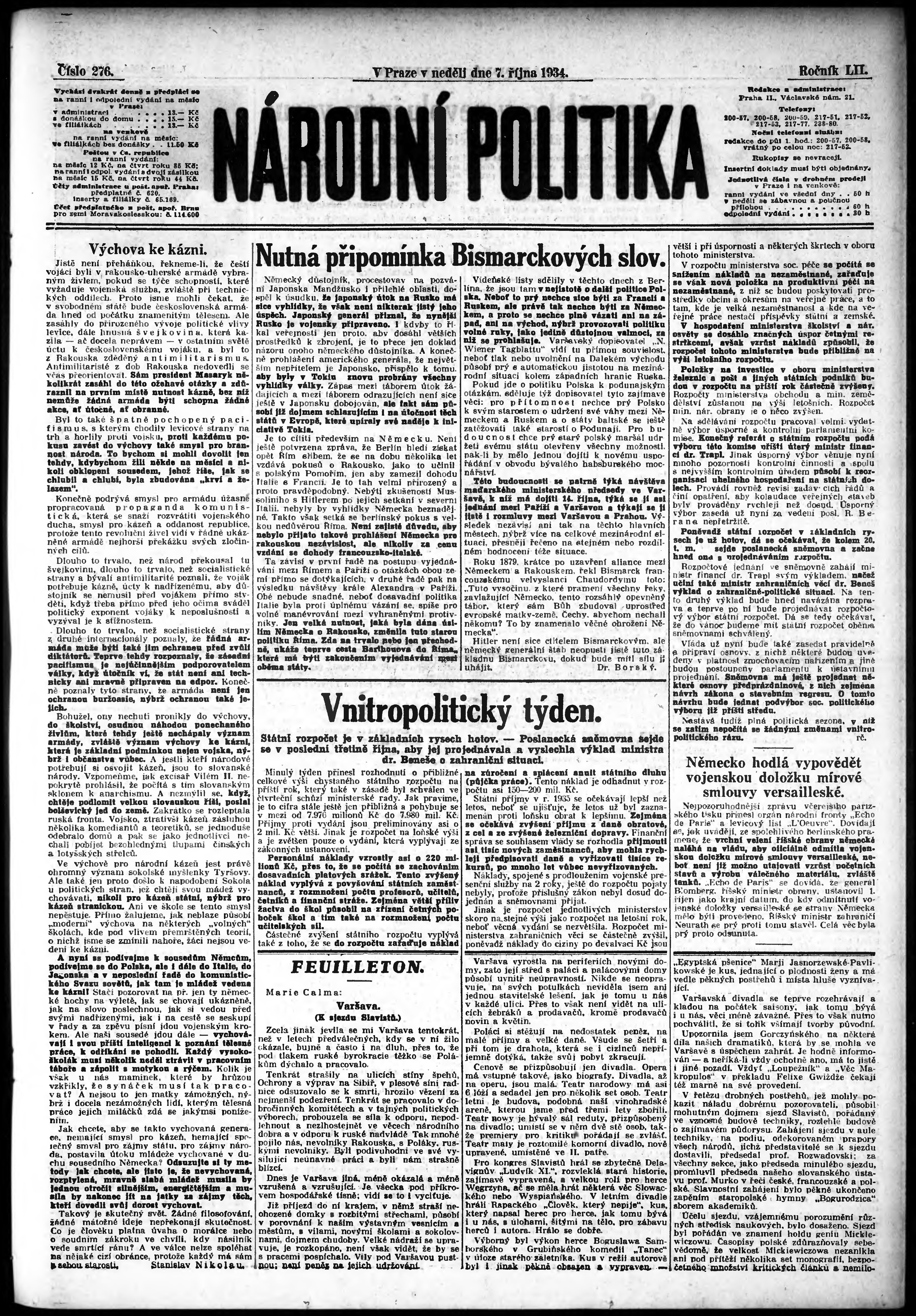 * Datum vydání výtisku: 7.10.1934 Číslo výtisku: 276 Poznámky k výtisku: ranní vydání;