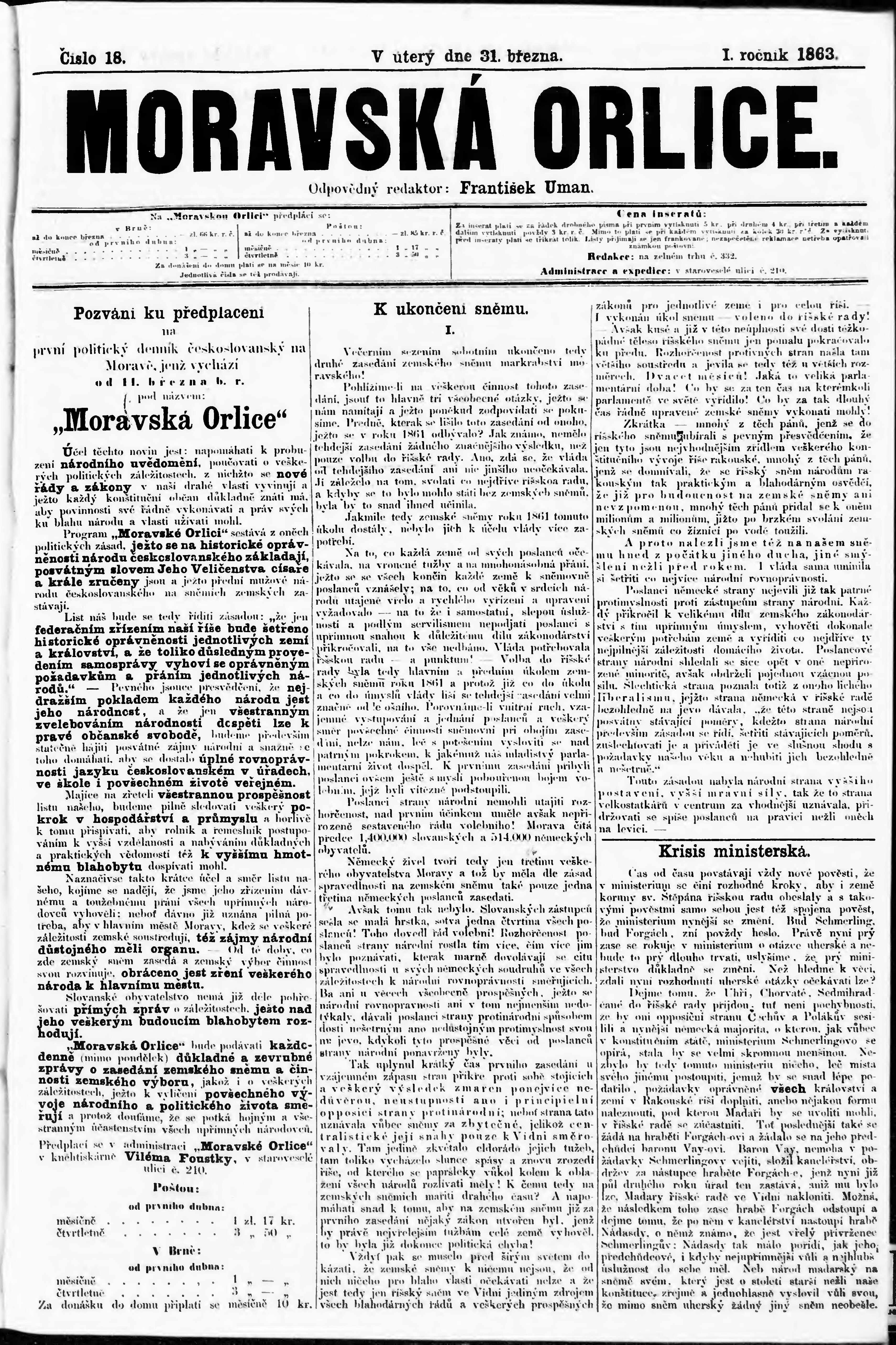 * Datum vydání výtisku: 31.3.1863 Číslo výtisku: 18
