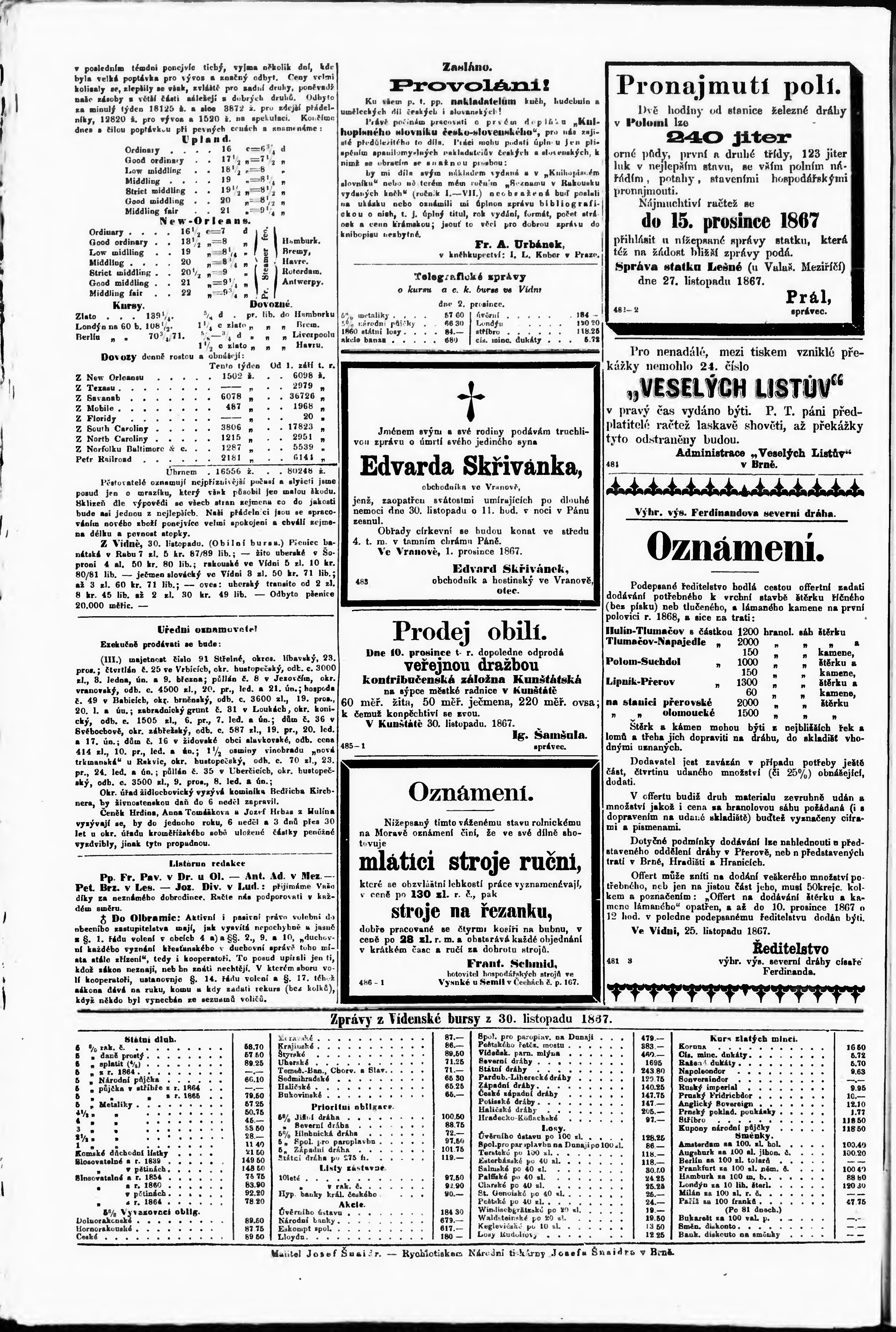 * Datum vydání výtisku: 3.12.1867 Číslo výtisku: 278
