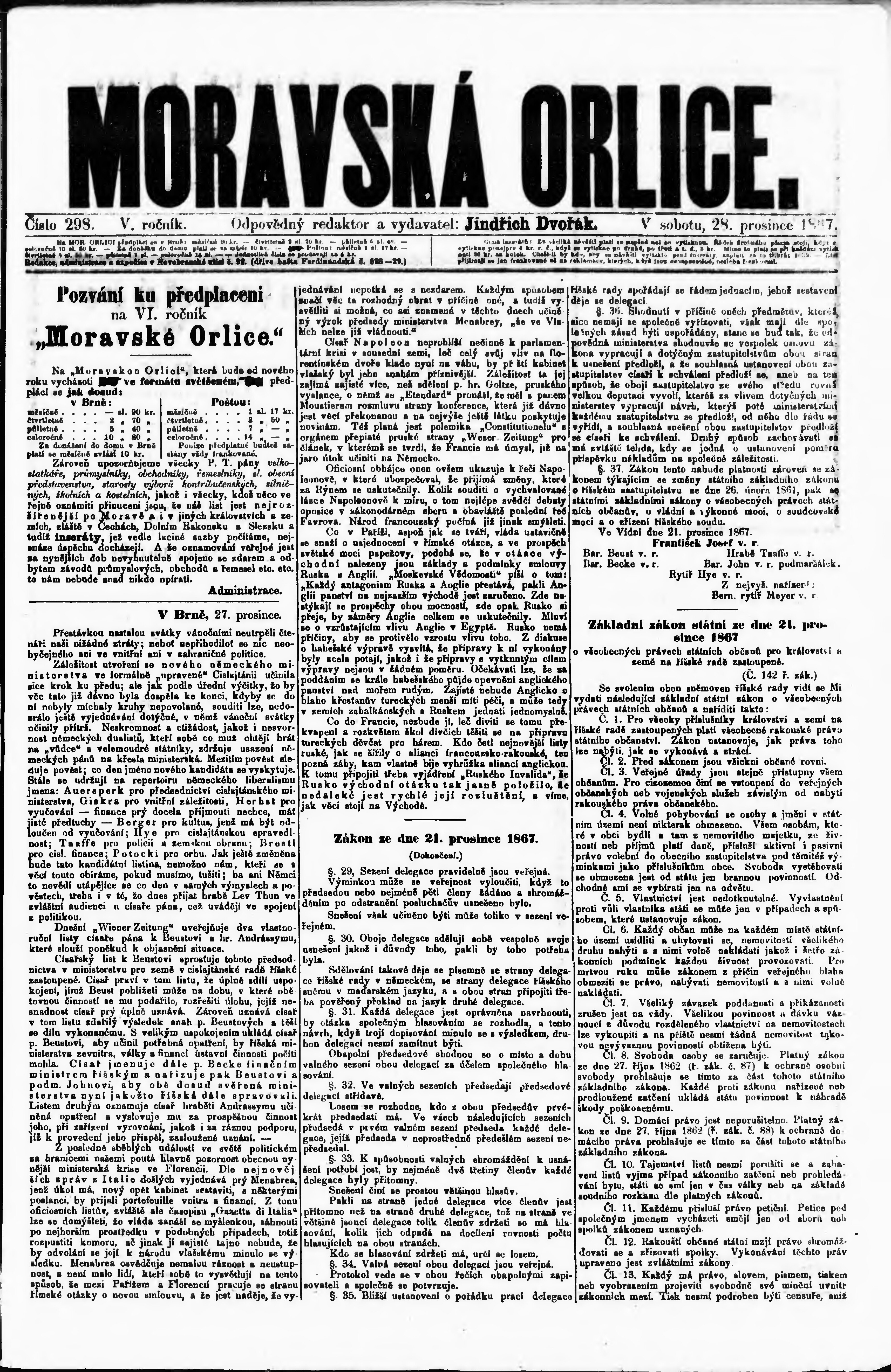 * Datum vydání výtisku: 28.12.1867 Číslo výtisku: 298