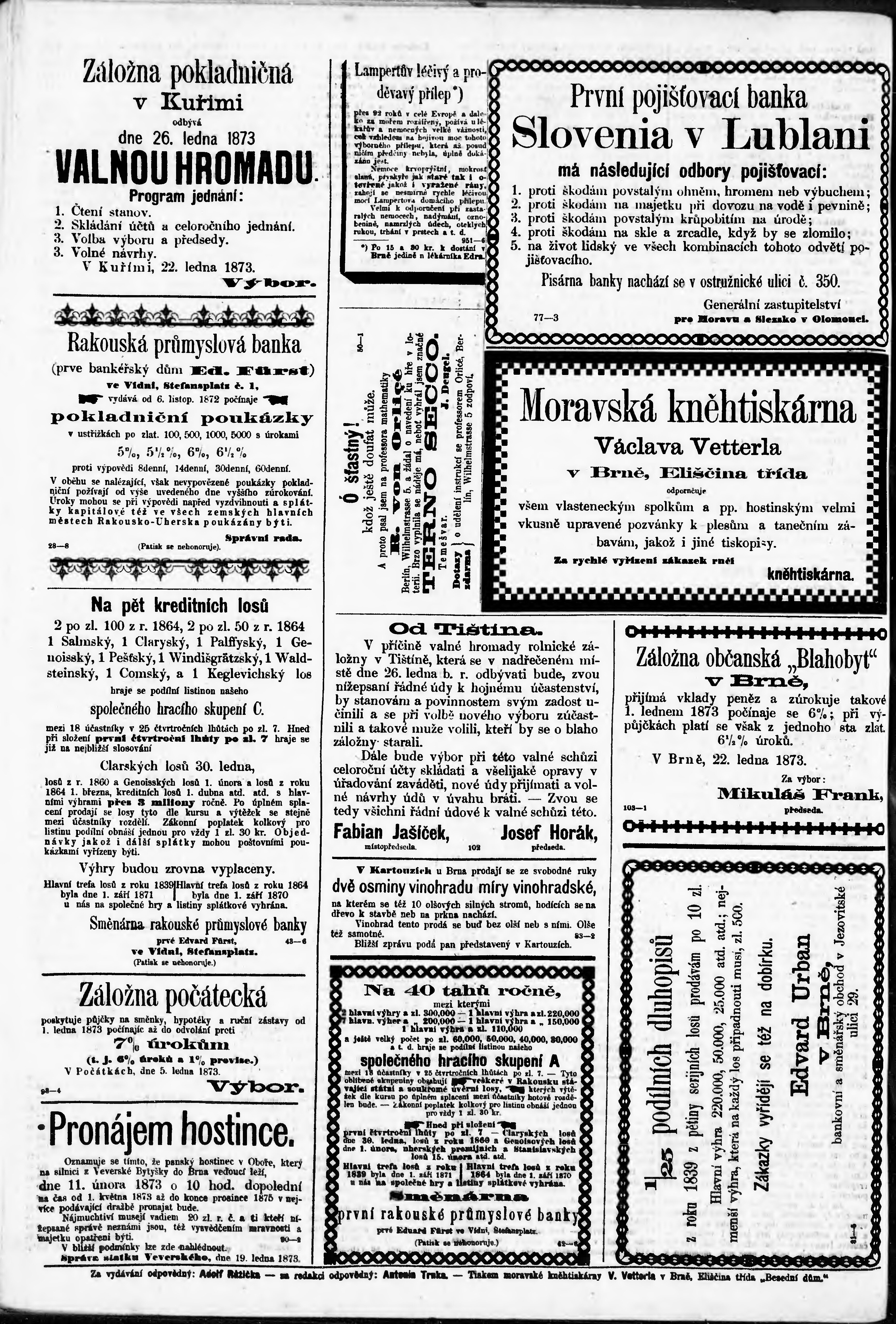 * Datum vydání výtisku: 25.1.1873 Číslo výtisku: 20