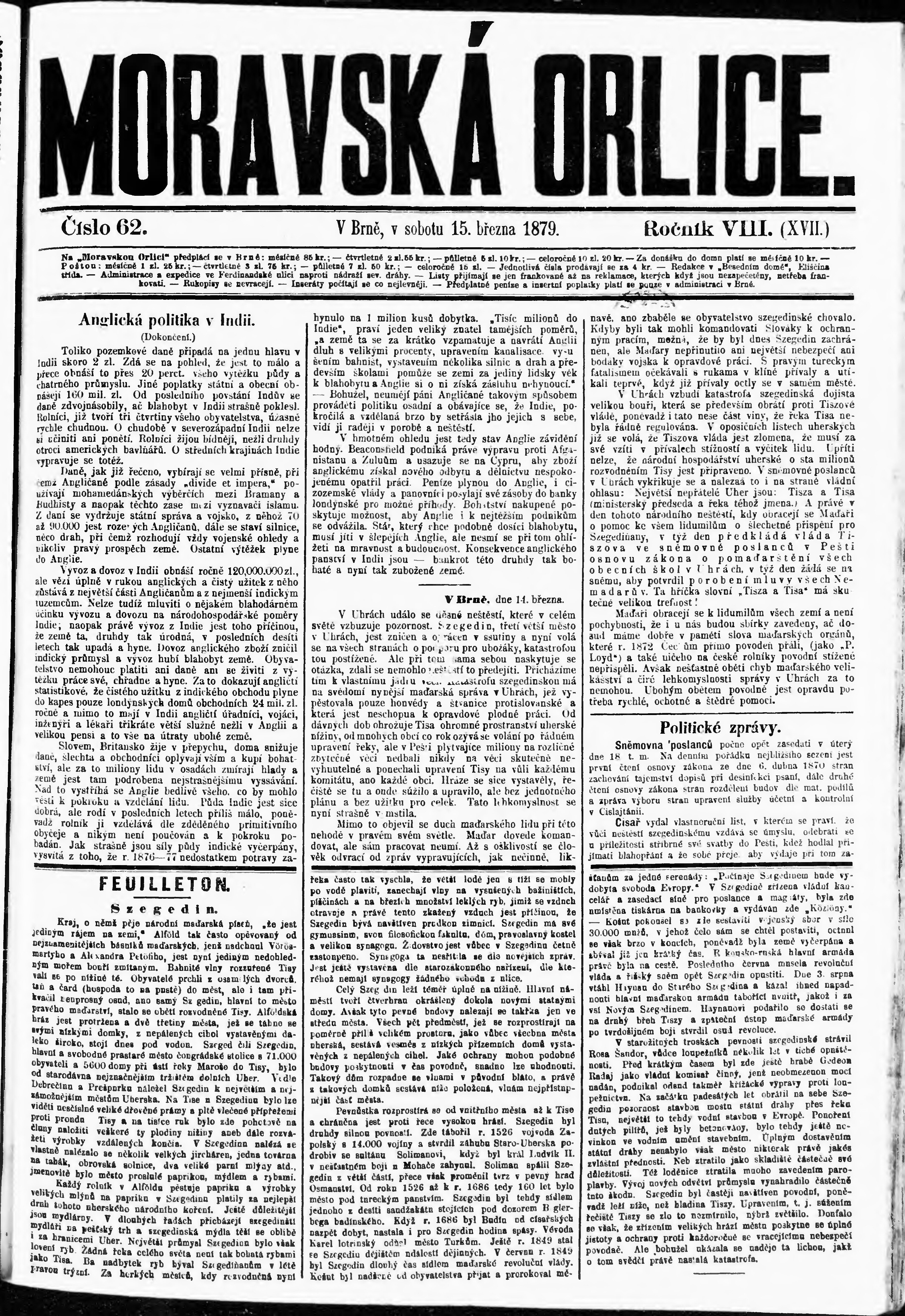 * Datum vydání výtisku: 15.3.1879 Číslo výtisku: 62