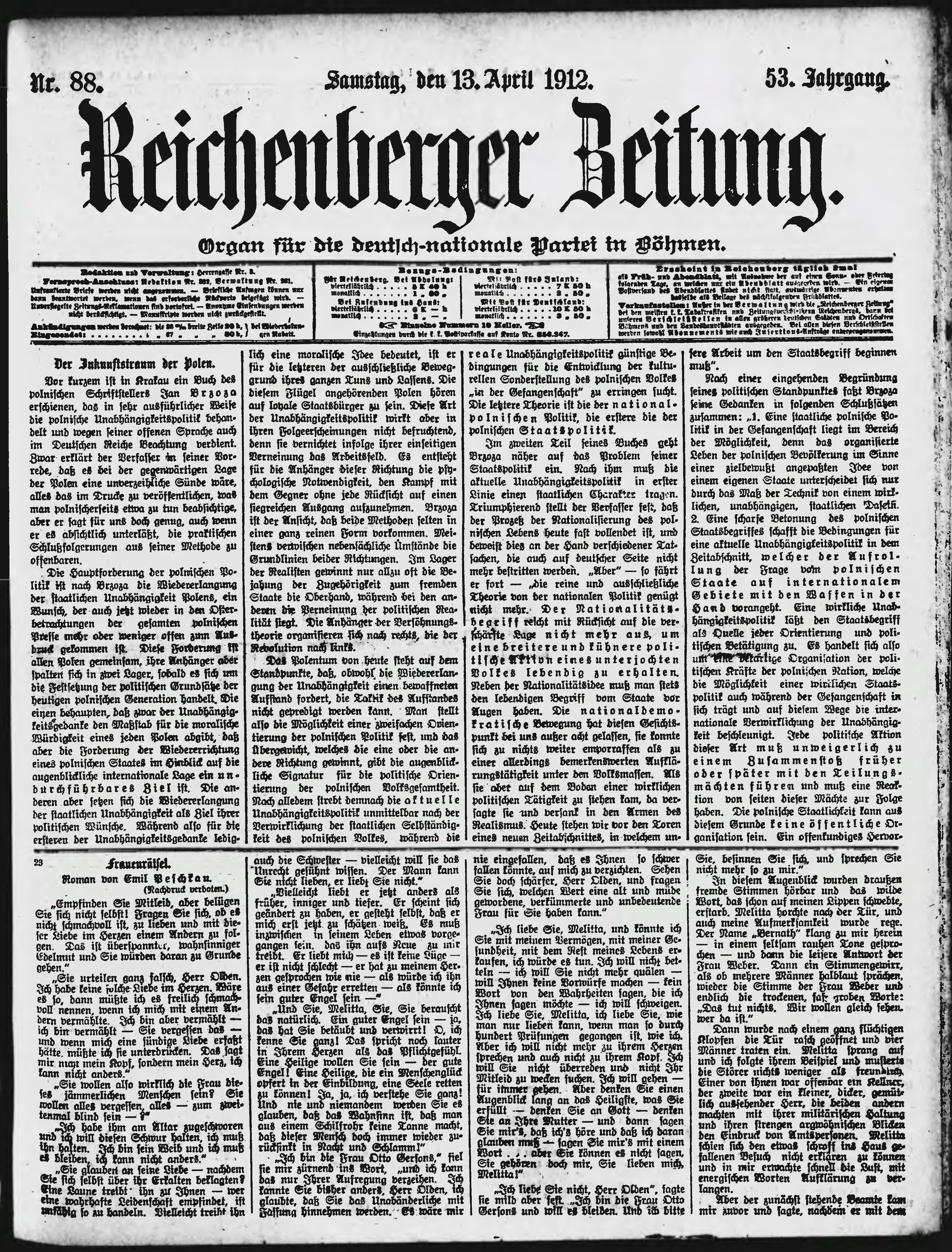 * Datum vydání výtisku: 13.4.1912 Číslo výtisku: 88 Poznámky k výtisku: ranní vydání;