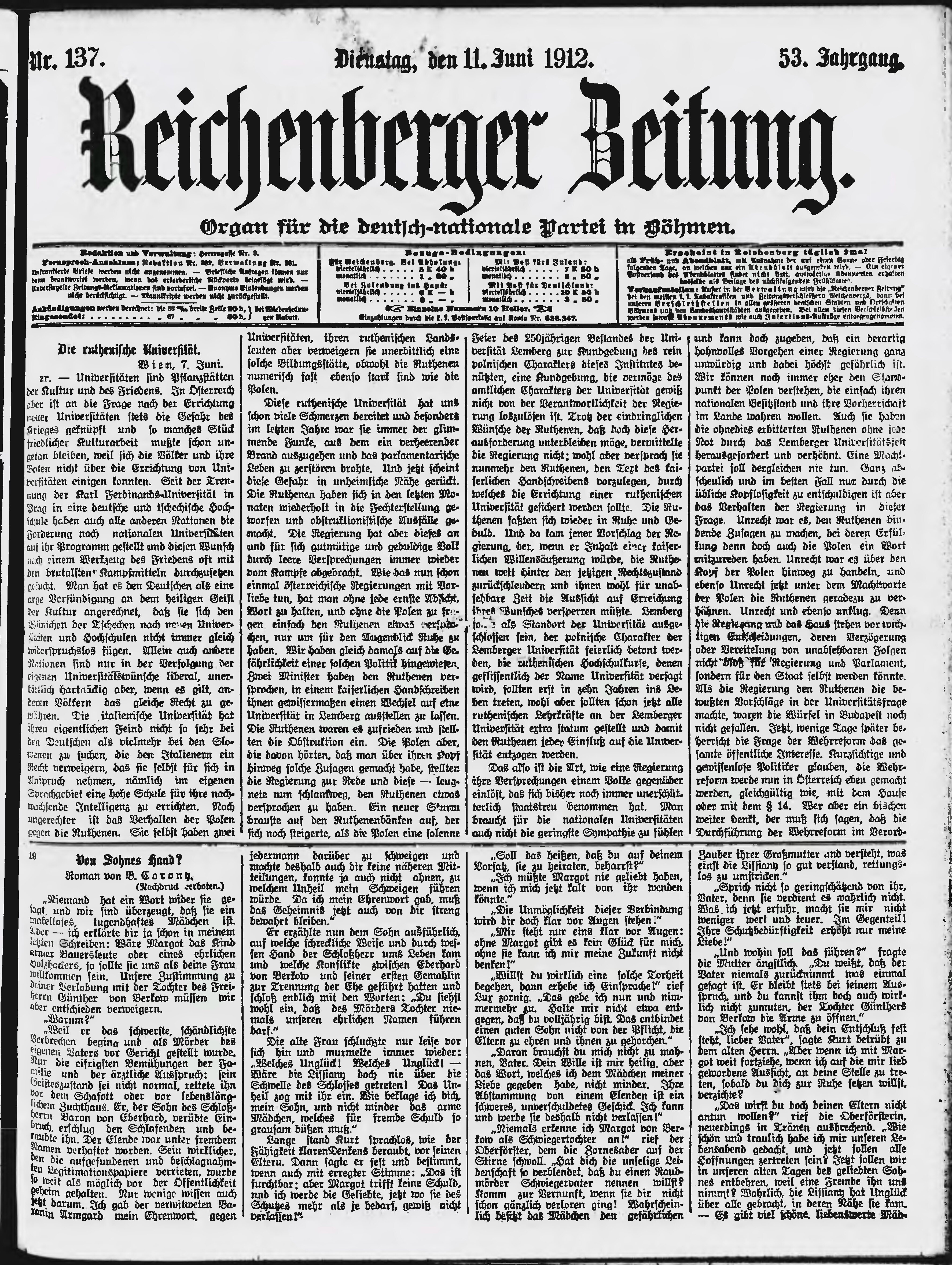* Datum vydání výtisku: 11.6.1912 Číslo výtisku: 137 Poznámky k výtisku: ranní vydání;