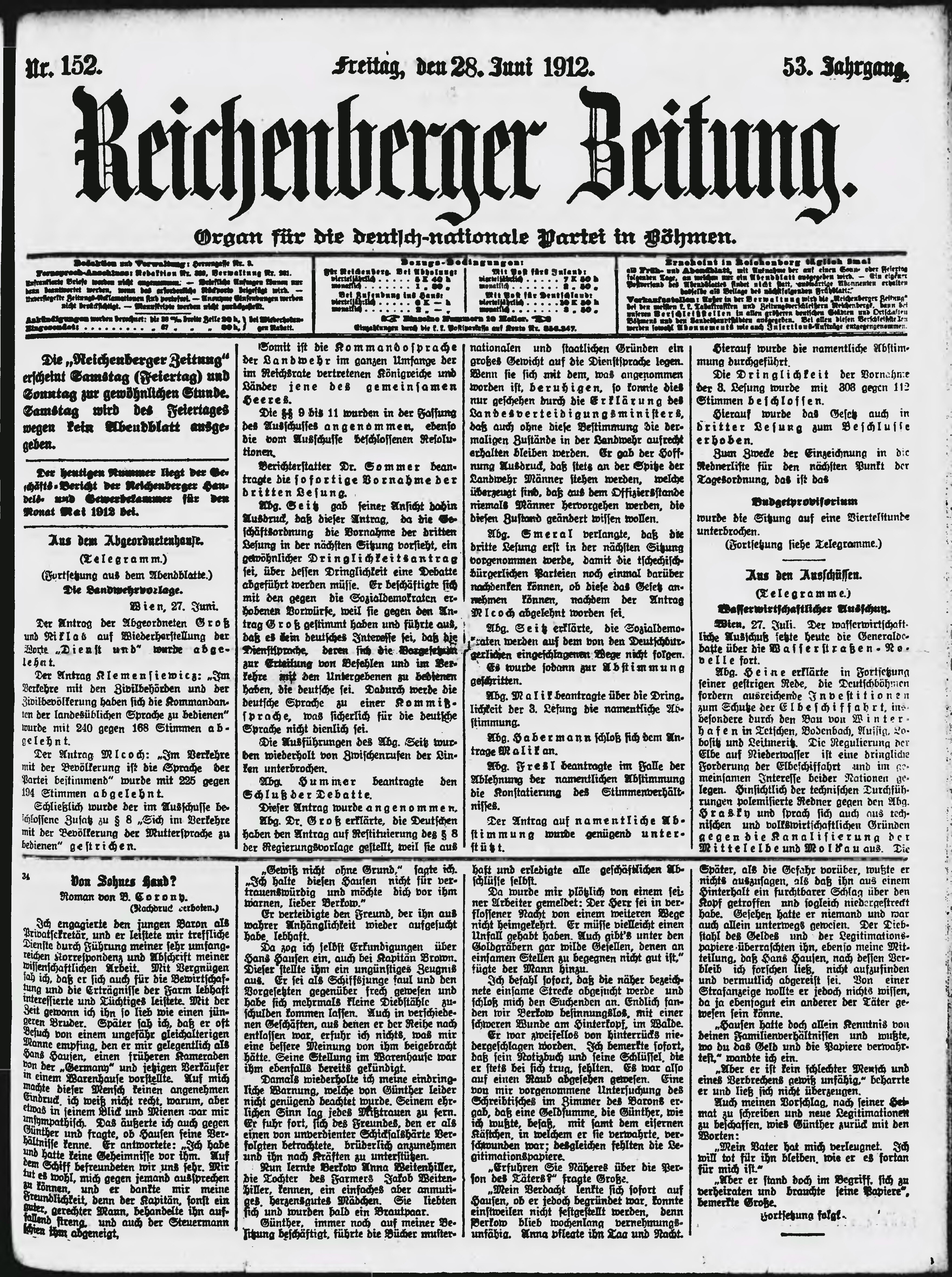 * Datum vydání výtisku: 28.6.1912 Číslo výtisku: 152 Poznámky k výtisku: ranní vydání;