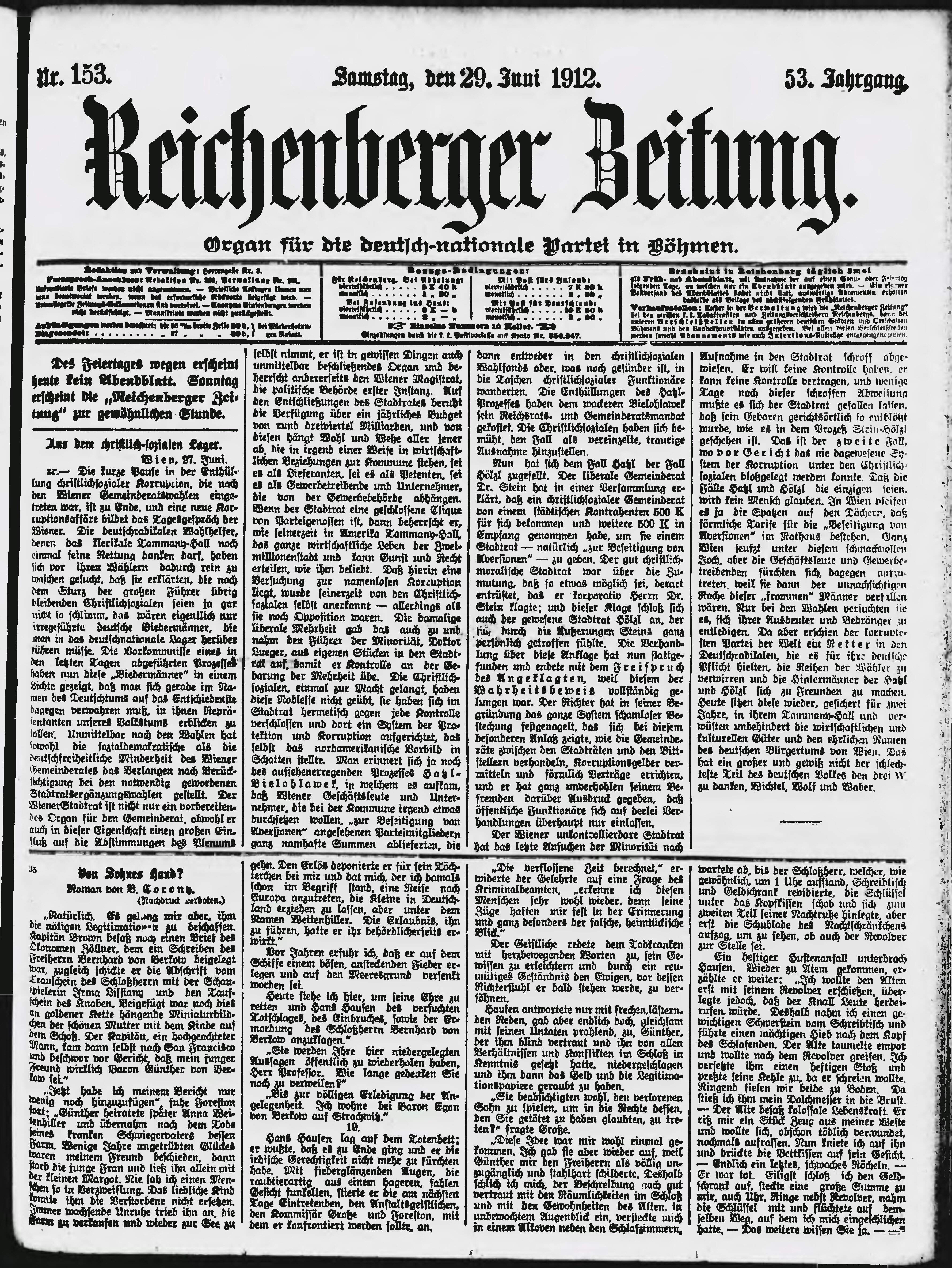 * Datum vydání výtisku: 29.6.1912 Číslo výtisku: 153 Poznámky k výtisku: ranní vydání;