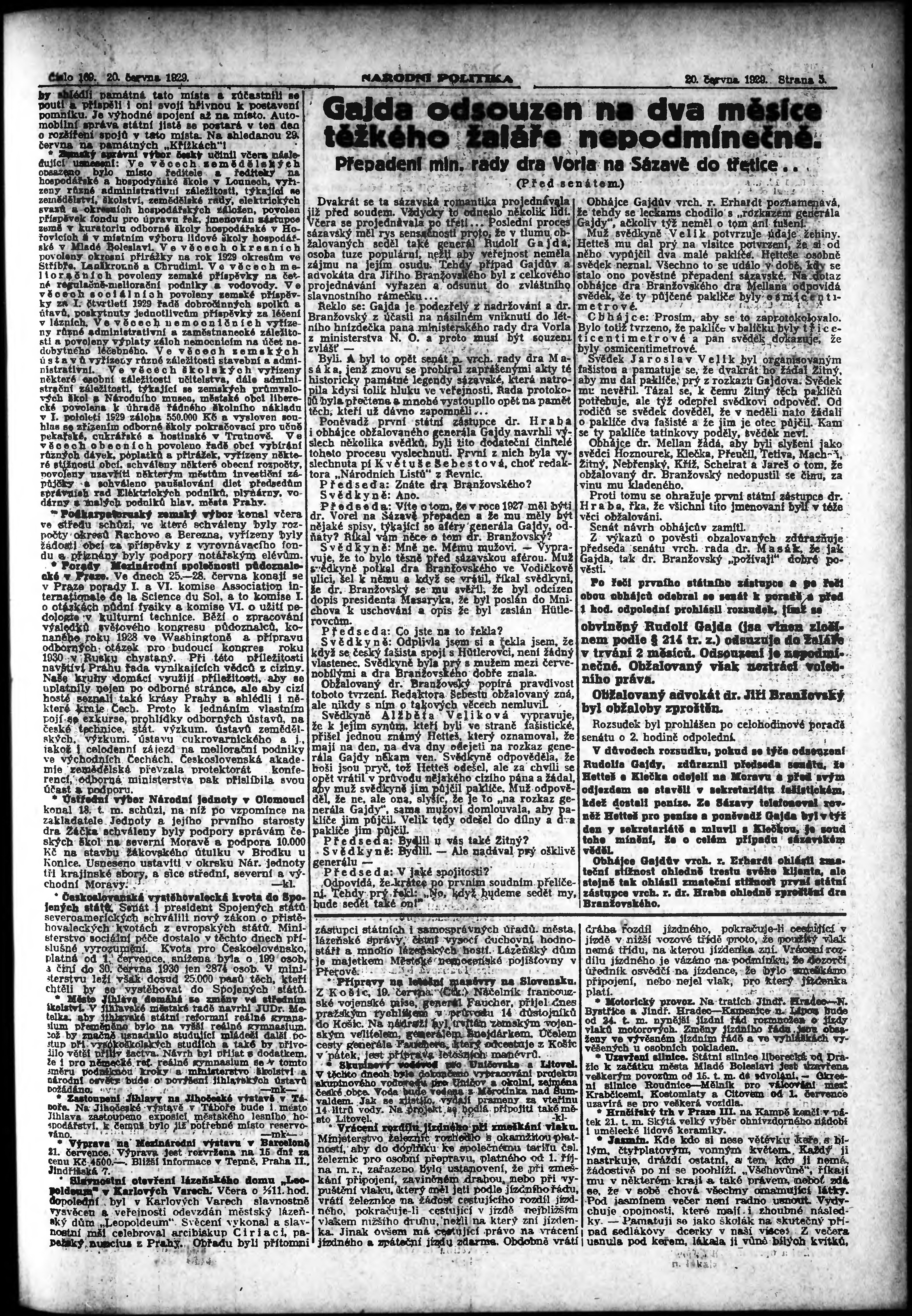 * Datum vydání výtisku: 20.6.1929 Číslo výtisku: 169 Poznámky k výtisku: ranní vydání; vydání pro Prahu;