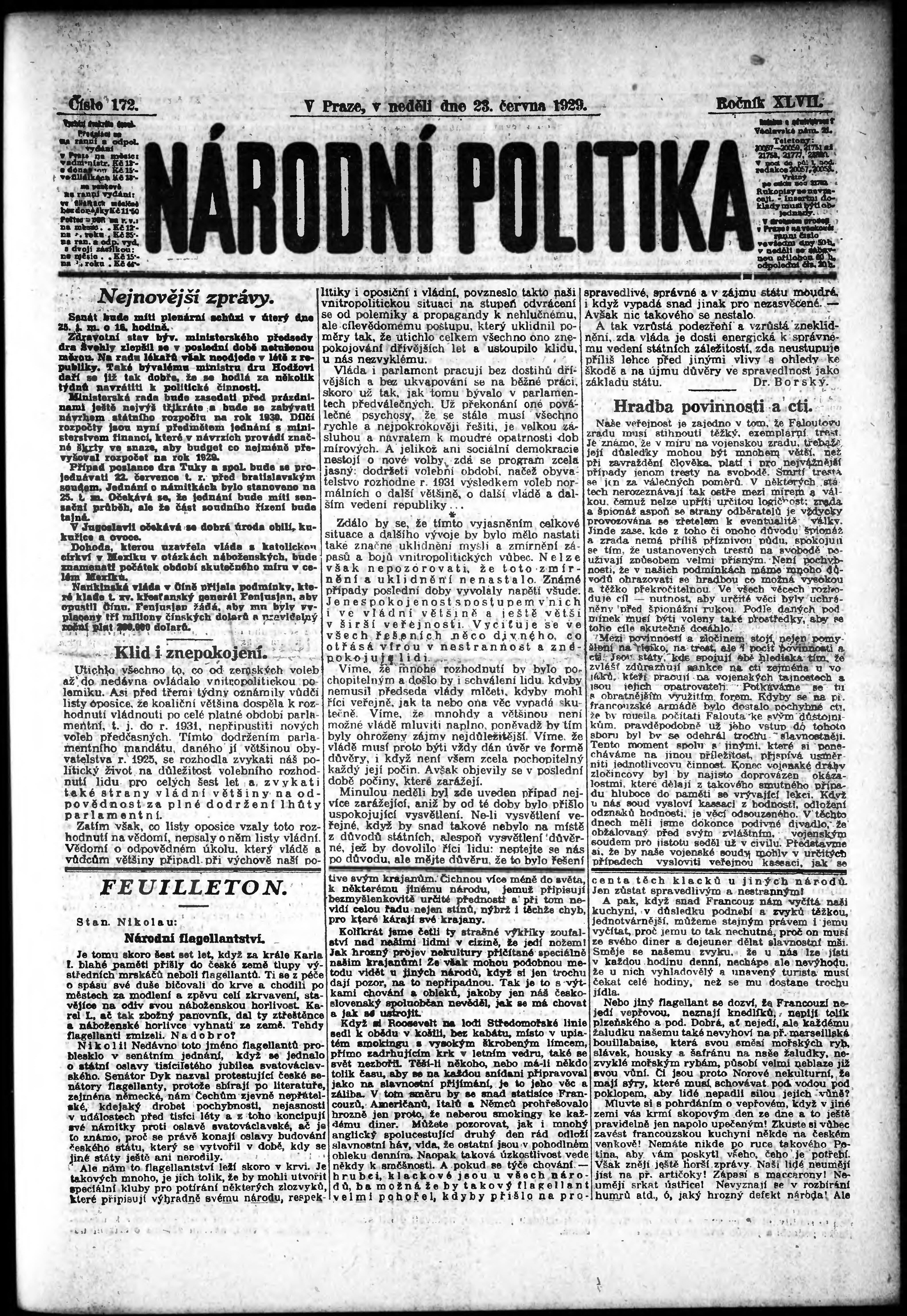 * Datum vydání výtisku: 23.6.1929 Číslo výtisku: 172 Poznámky k výtisku: ranní vydání;