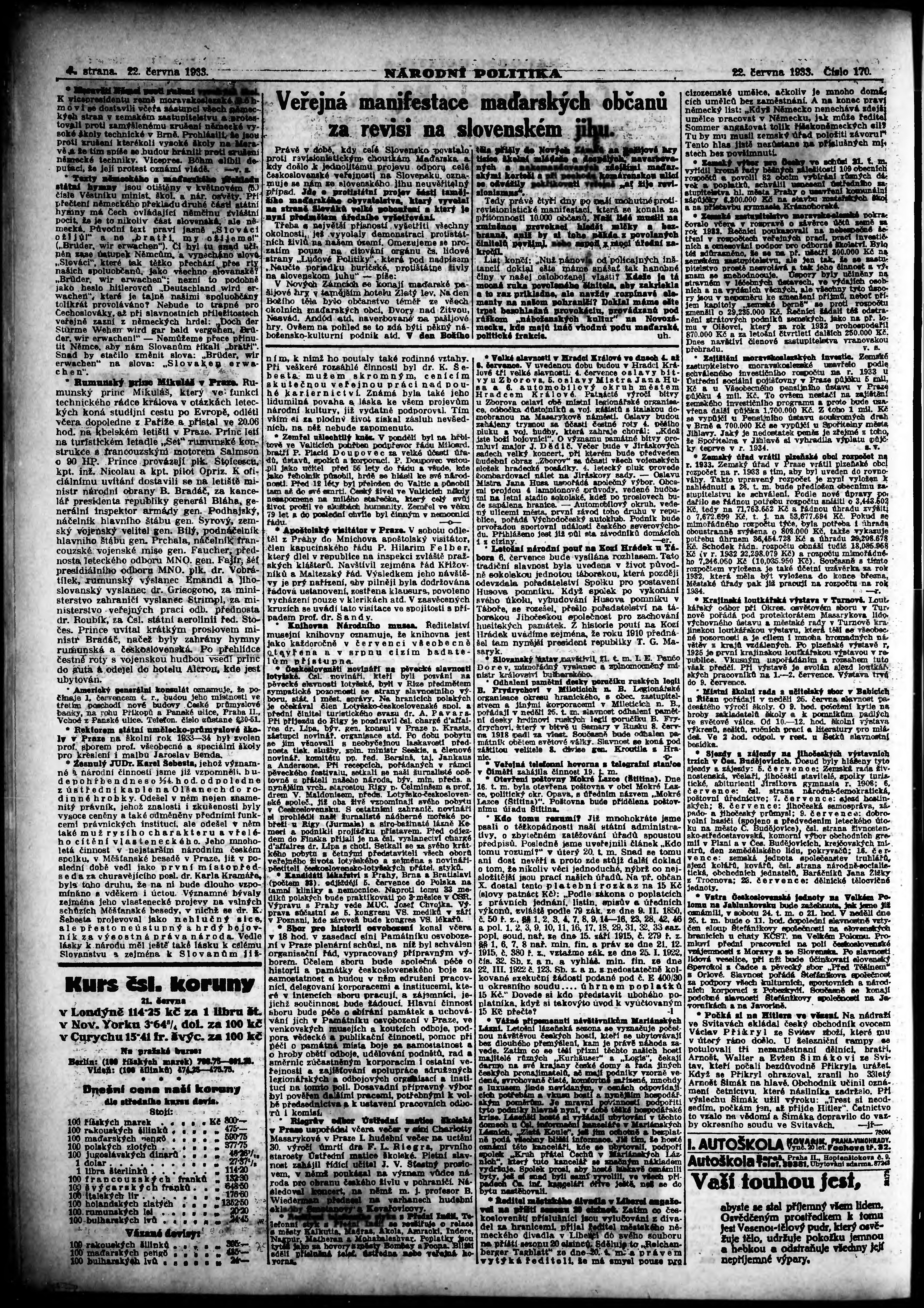 * Datum vydání výtisku: 22.6.1933 Číslo výtisku: 170 Poznámky k výtisku: ranní vydání; vydání pro Prahu;