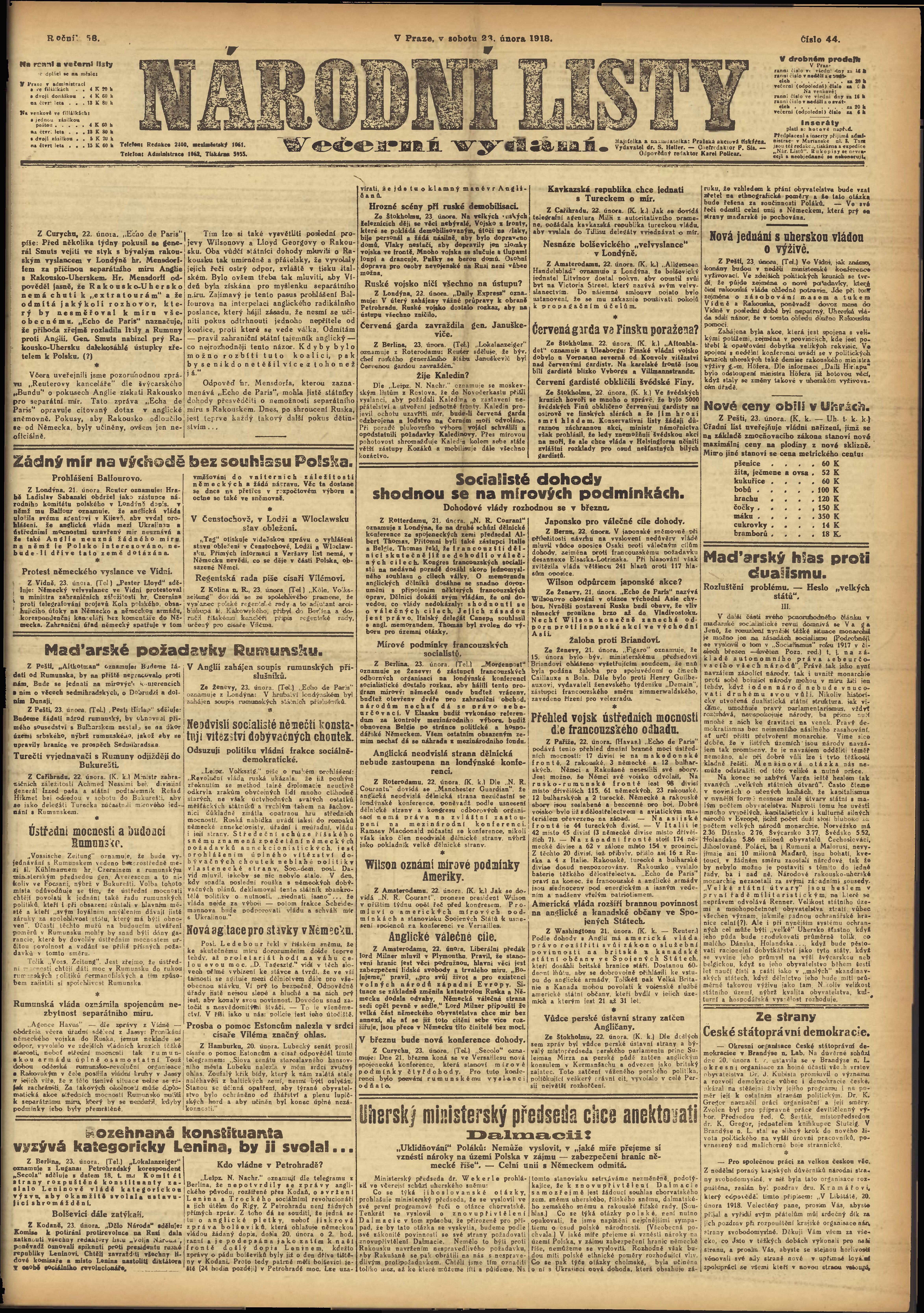 * Datum vydání výtisku: 23.2.1918 Číslo výtisku: 44 Poznámky k výtisku: večerní vydání;