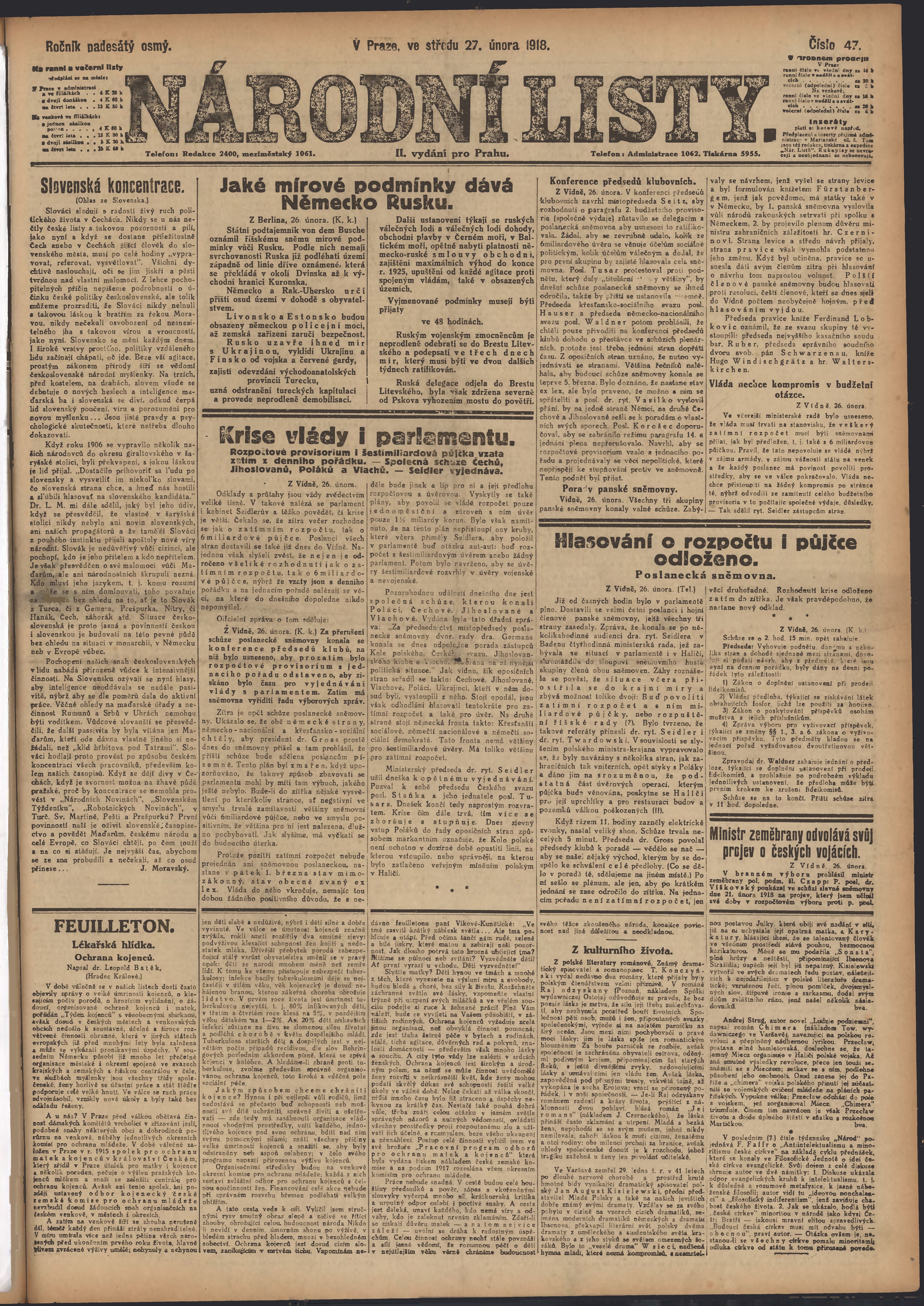 * Datum vydání výtisku: 27.2.1918 Číslo výtisku: 47 Poznámky k výtisku: ranní vydání; 2. vydání pro Prahu;
