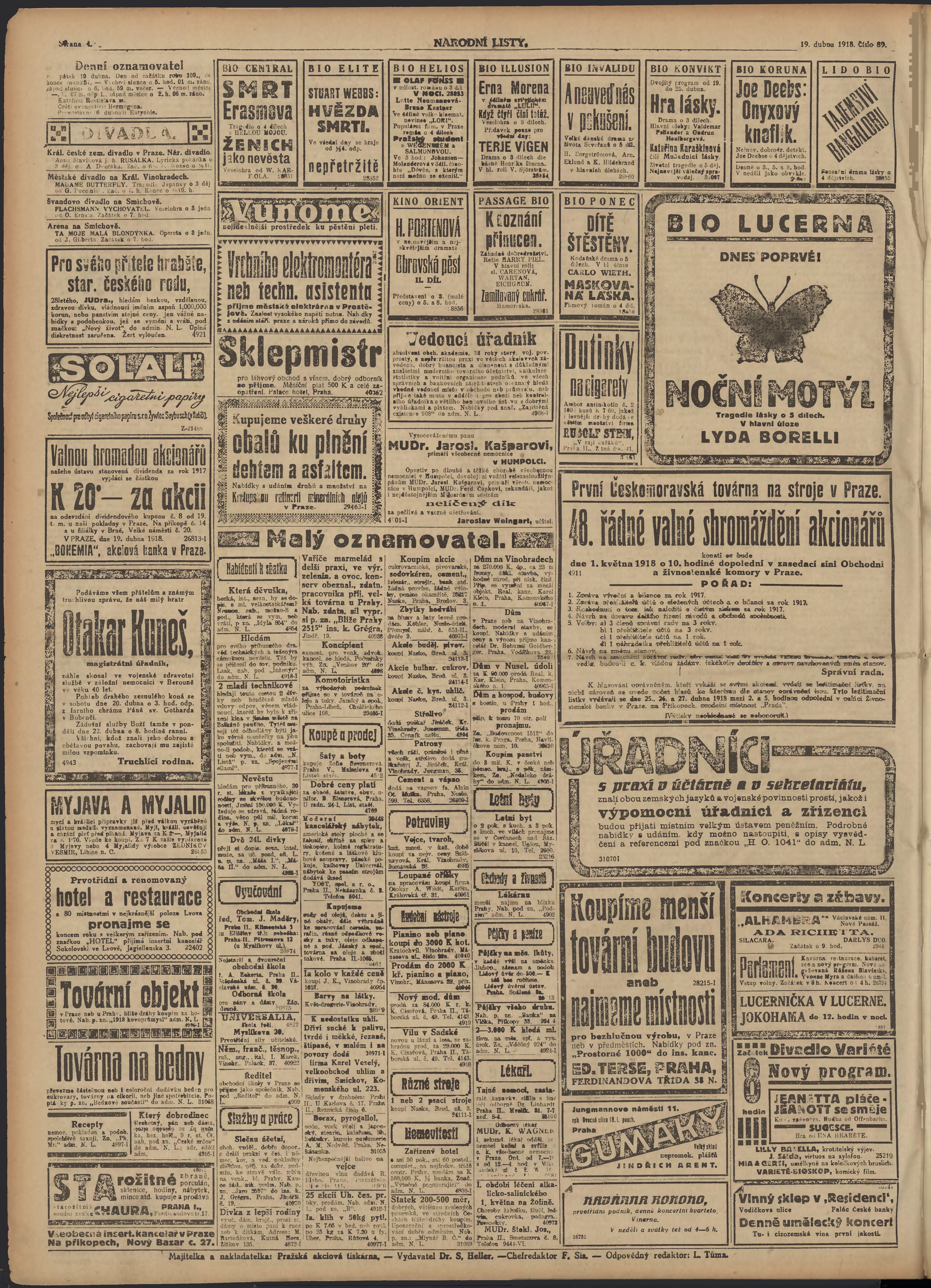 * Datum vydání výtisku: 19.4.1918 Číslo výtisku: 89 Poznámky k výtisku: ranní vydání; 2. vydání pro Prahu;