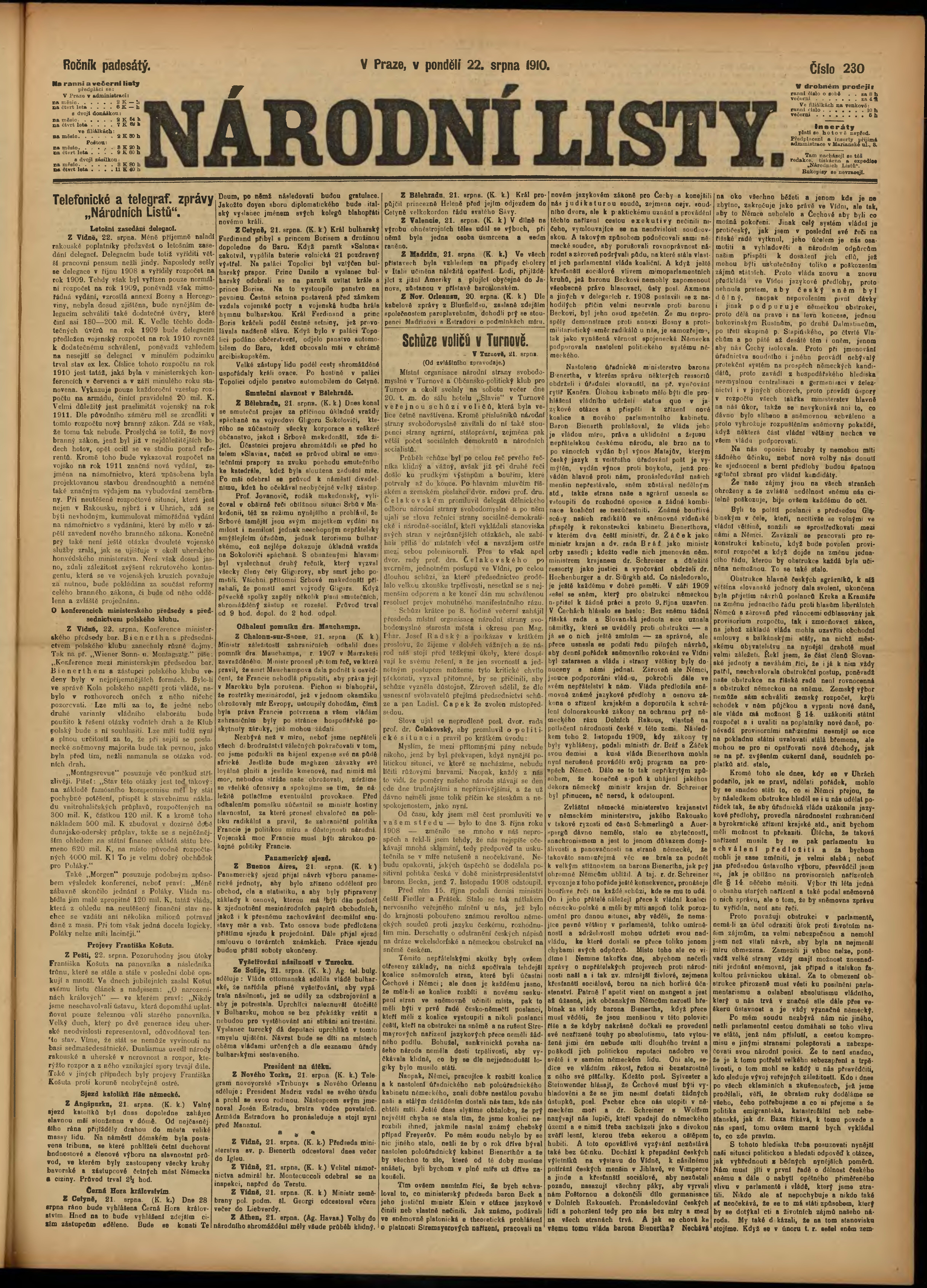 * Datum vydání výtisku: 22.8.1910 Číslo výtisku: 230 Poznámky k výtisku: ranní vydání;