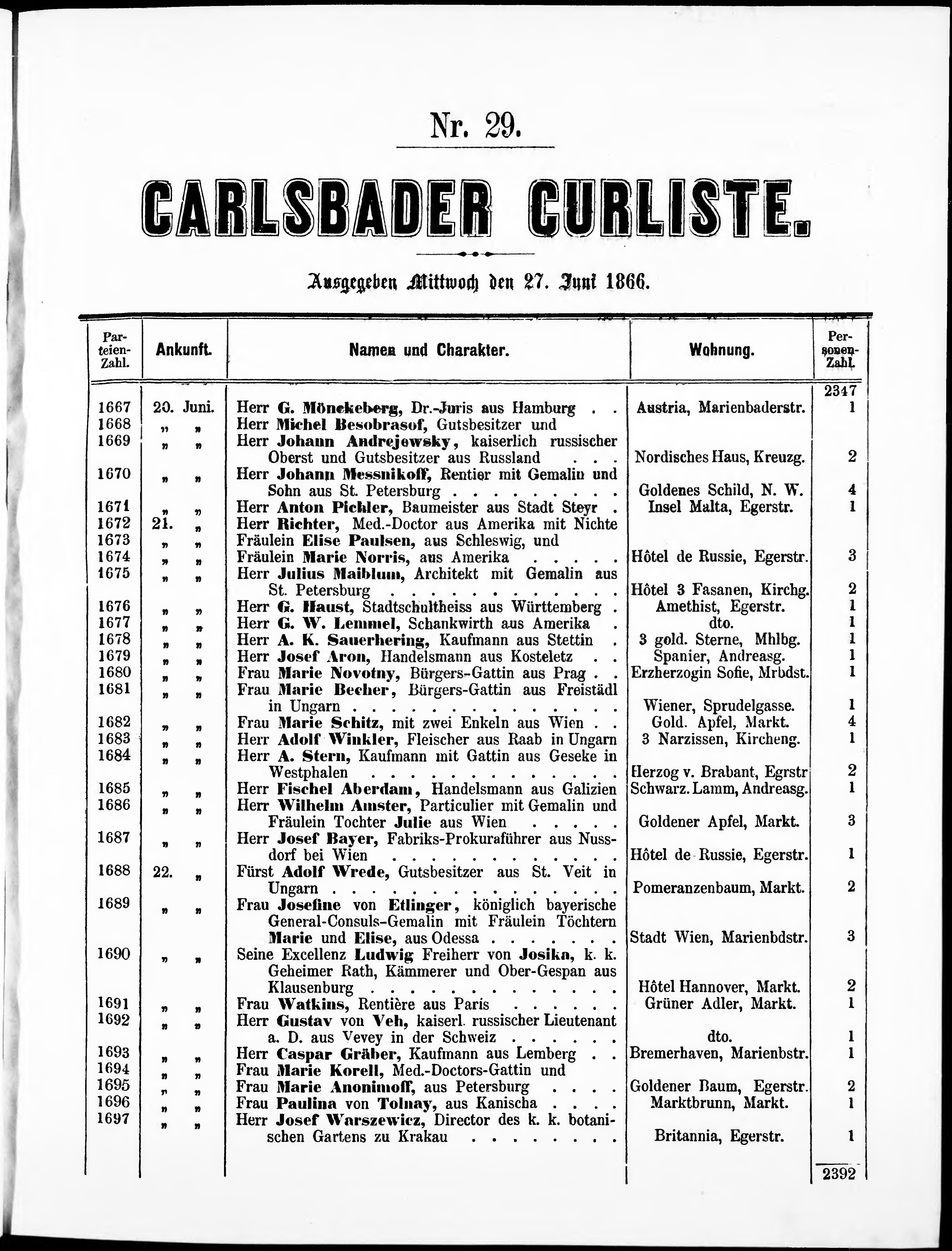 Liste der im Jahre ... angekommenen und abgereisten Kur- und Badegäste in Karlsb...