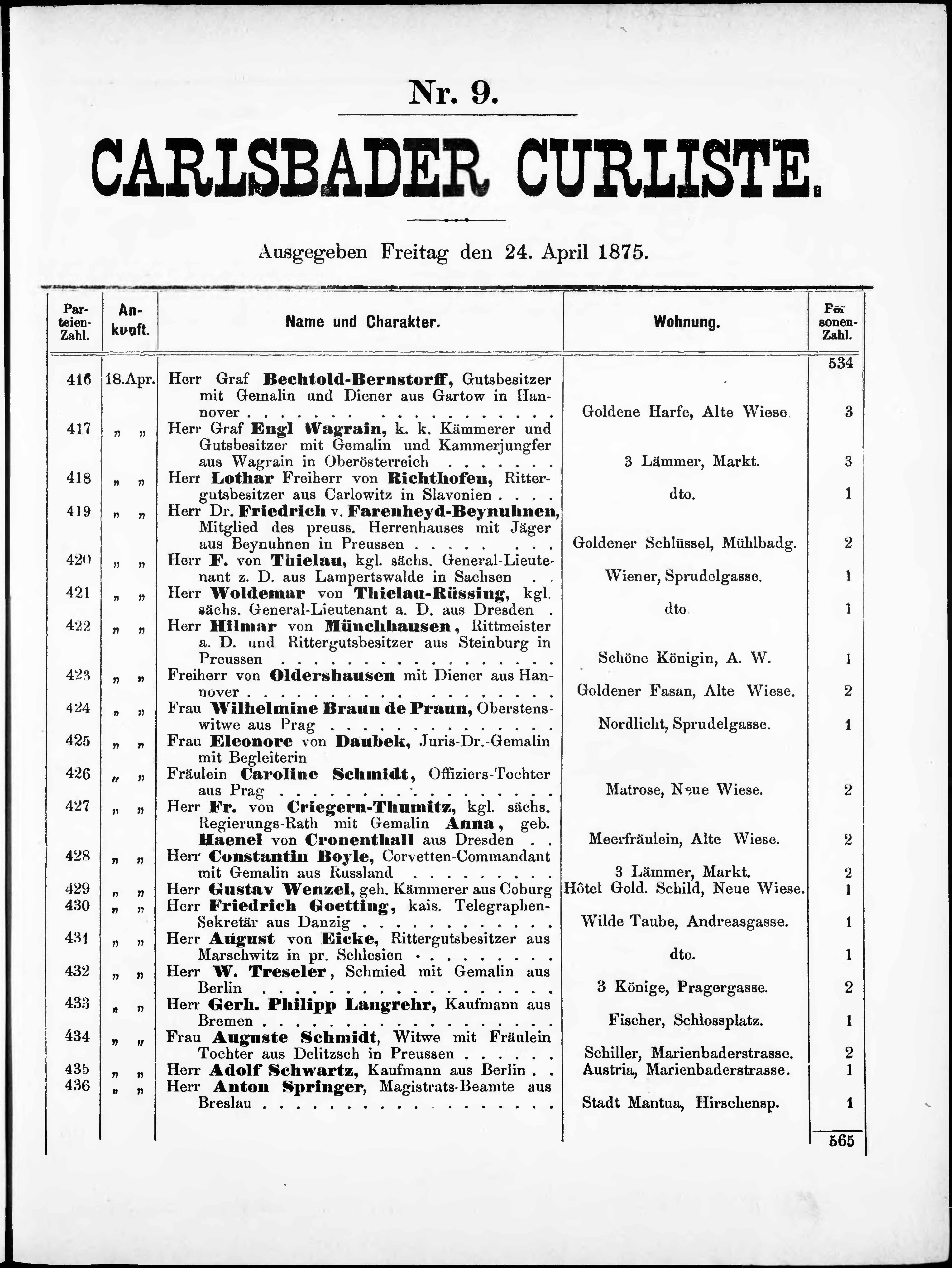 Liste der angekommenen und abgereisten P. T. Curgäste in Carlsbad im Jahre
