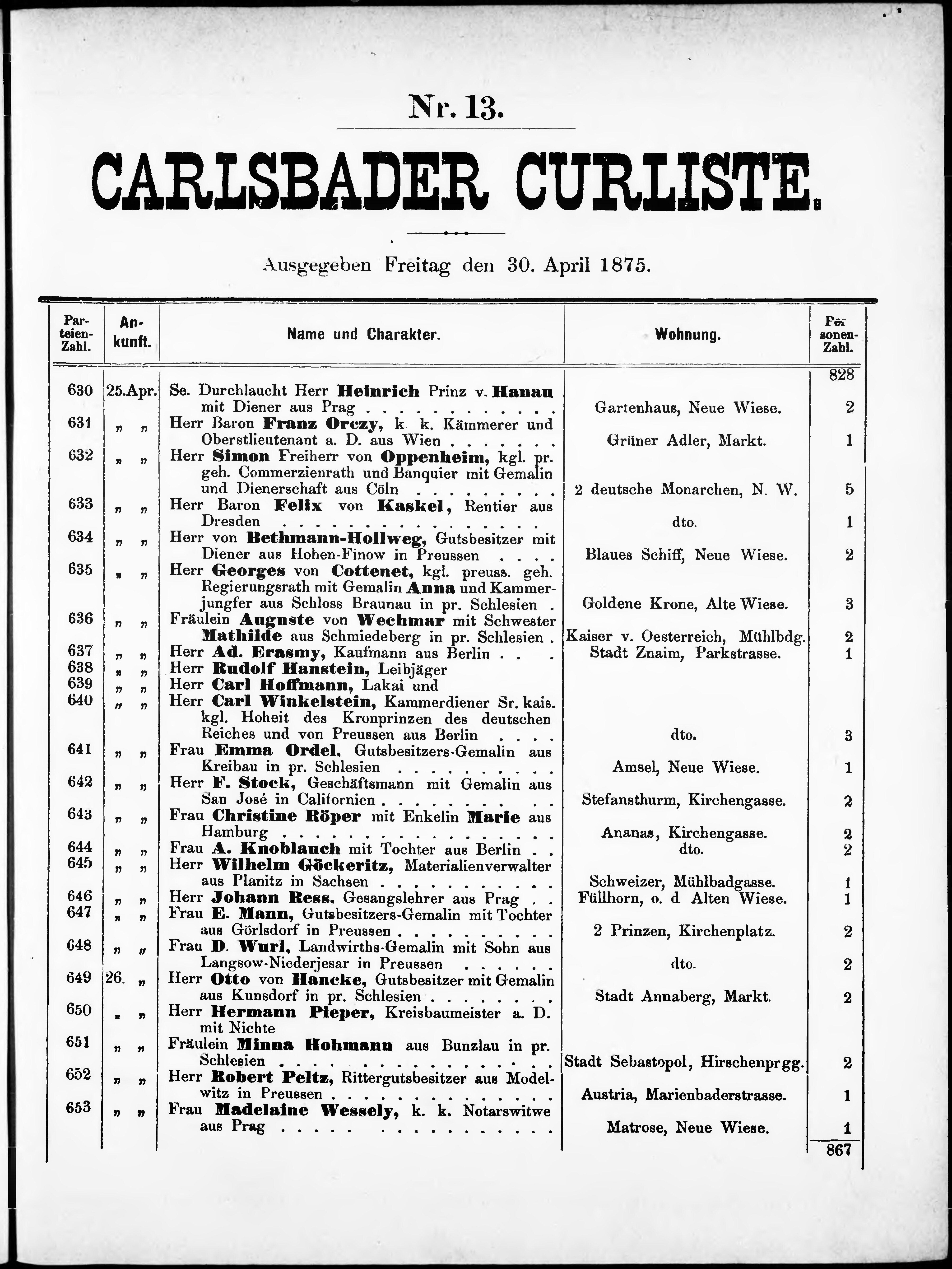 Liste der im Jahre ... angekommenen P.T. Kurgäste in der königl. Stadt Kaiser-Ca...