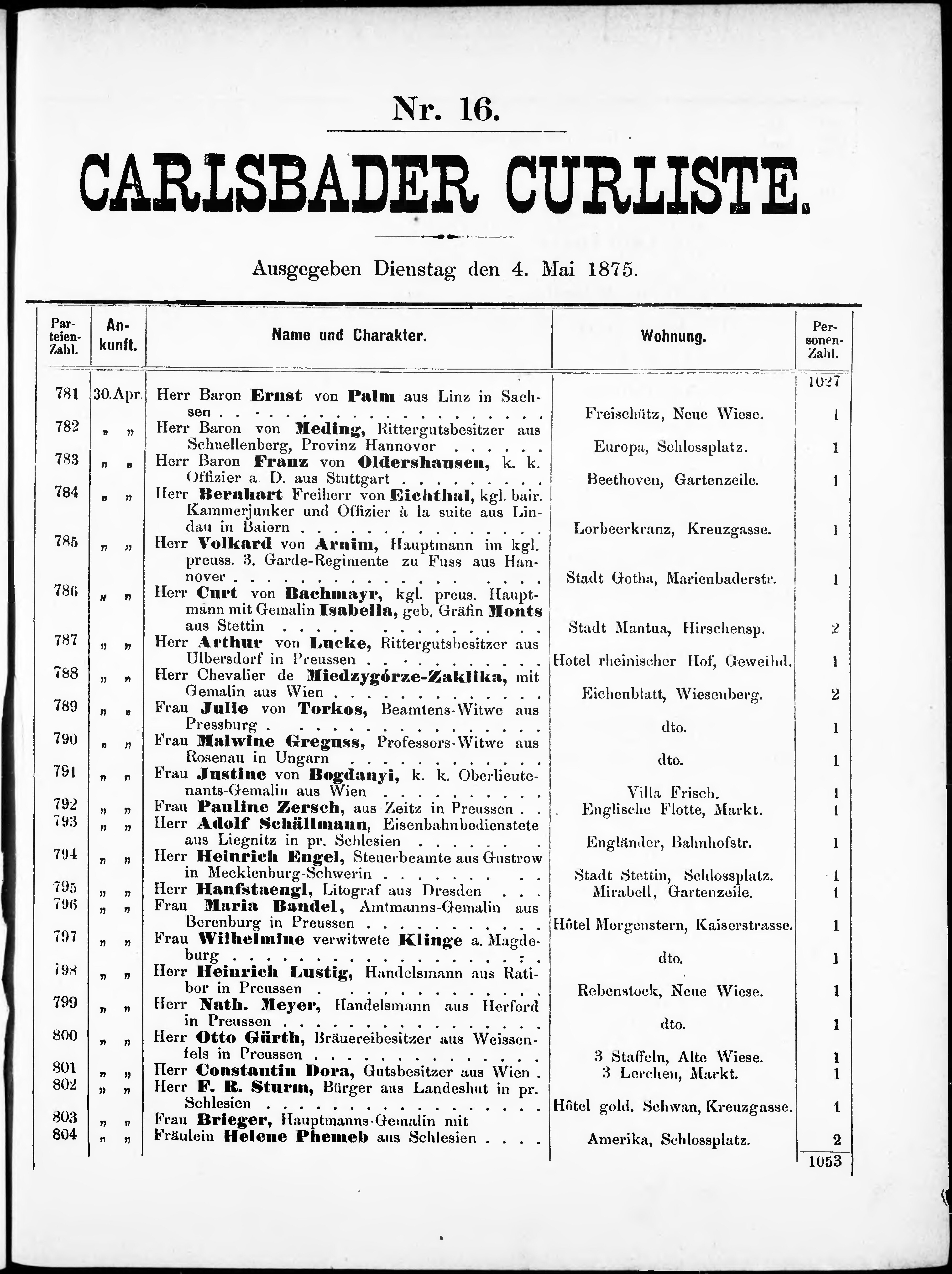 Liste der im Jahre ... angekommenen P.T. Kurgäste in der königl. Stadt Kaiser-Ca...