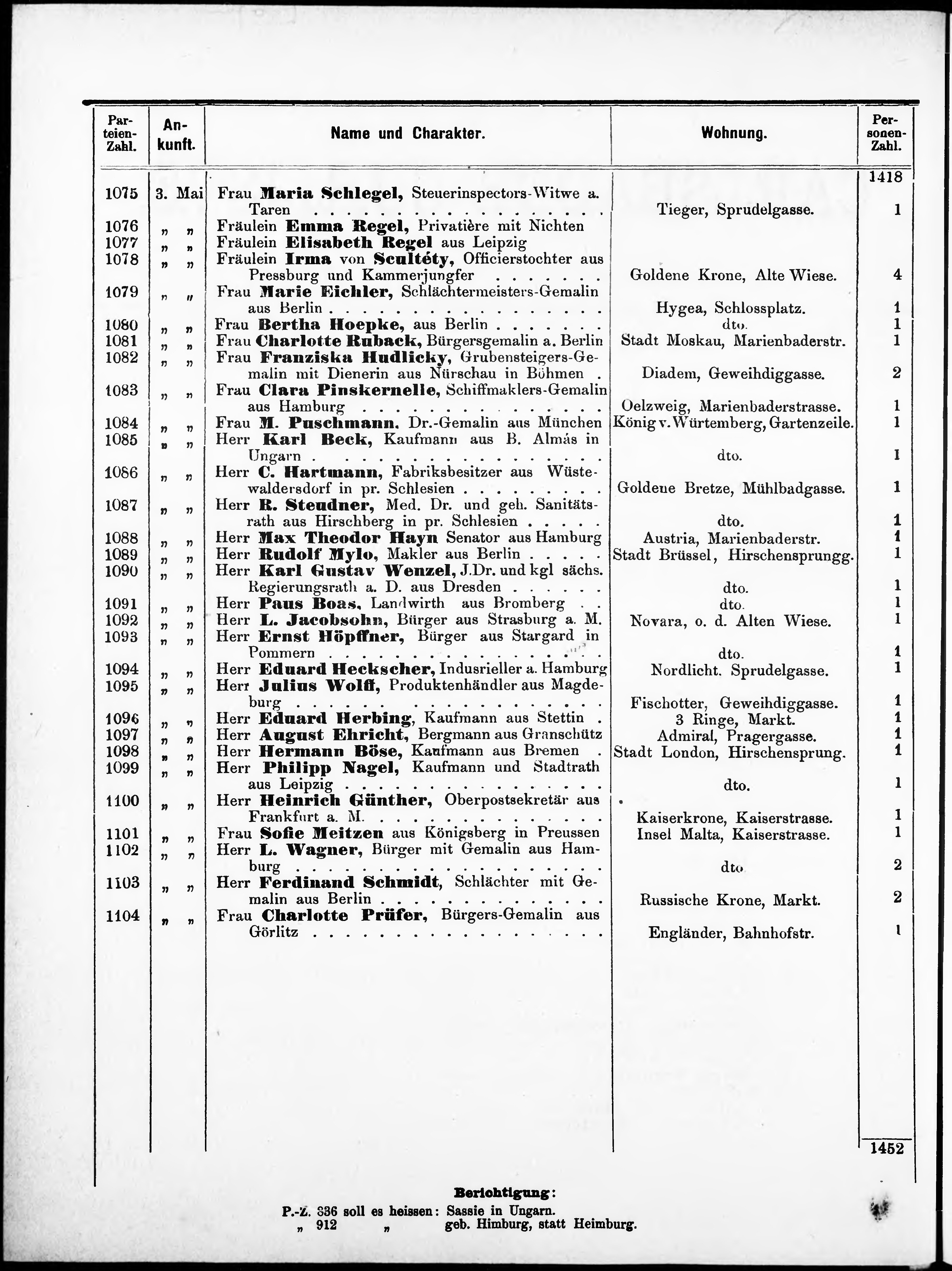 Liste der im Jahre ... angekommenen P.T. Kurgäste in der königl. Stadt Kaiser-Ca...