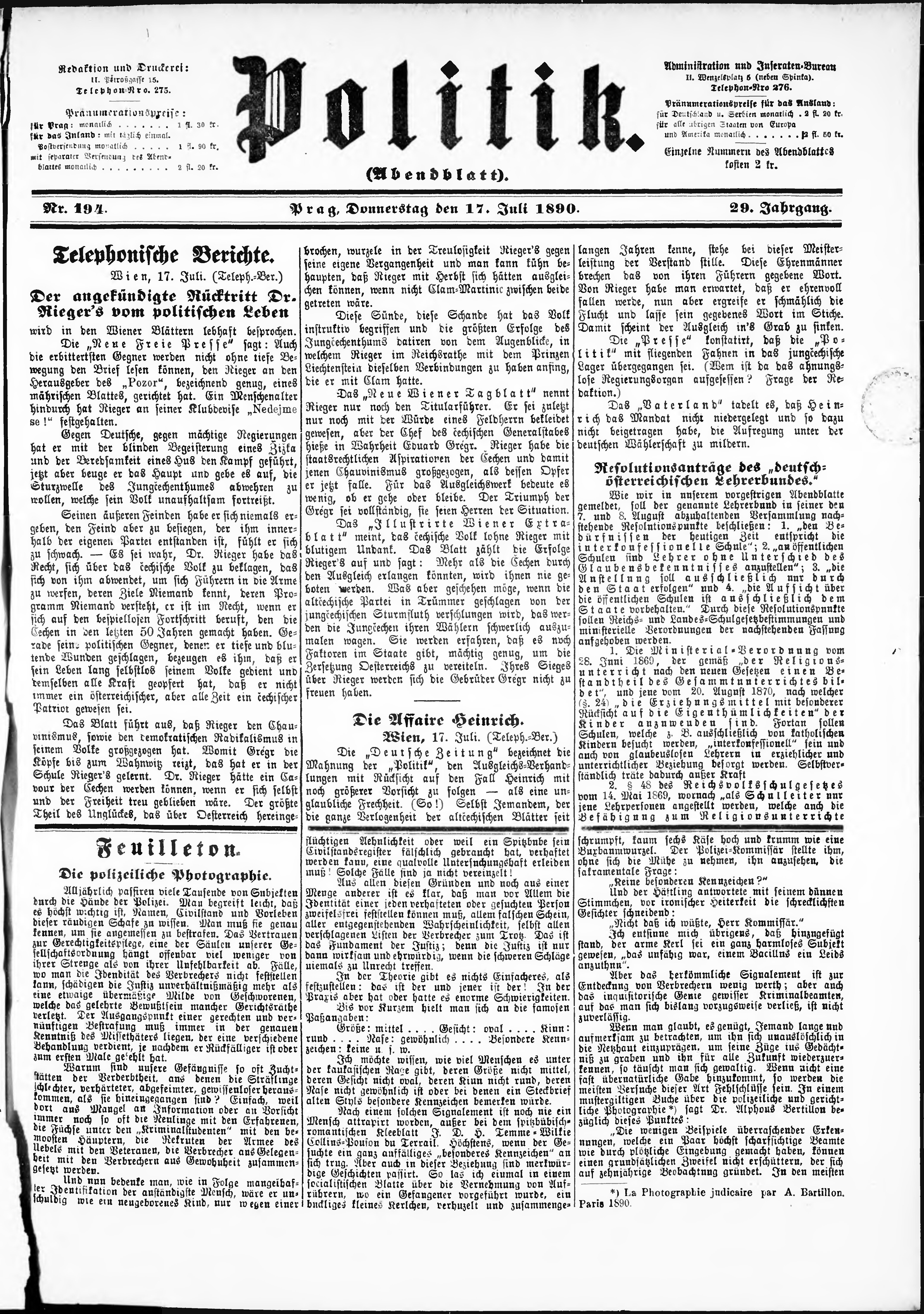 * Datum vydání výtisku: 17.7.1890 Číslo výtisku: 194 Poznámky k výtisku: večerní vydání;