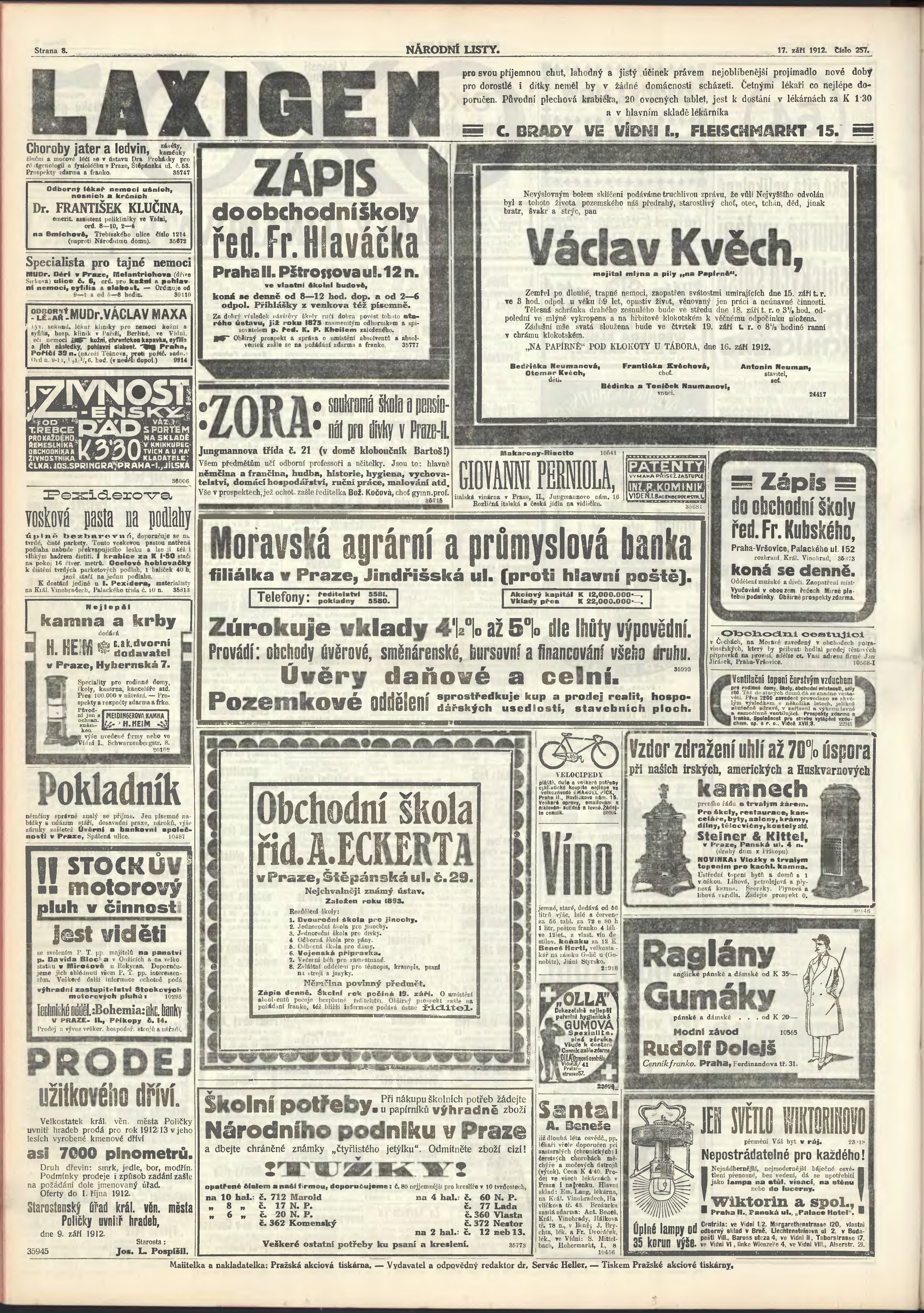 * Datum vydání výtisku: 17.9.1912 Číslo výtisku: 257 Poznámky k výtisku: ranní vydání;