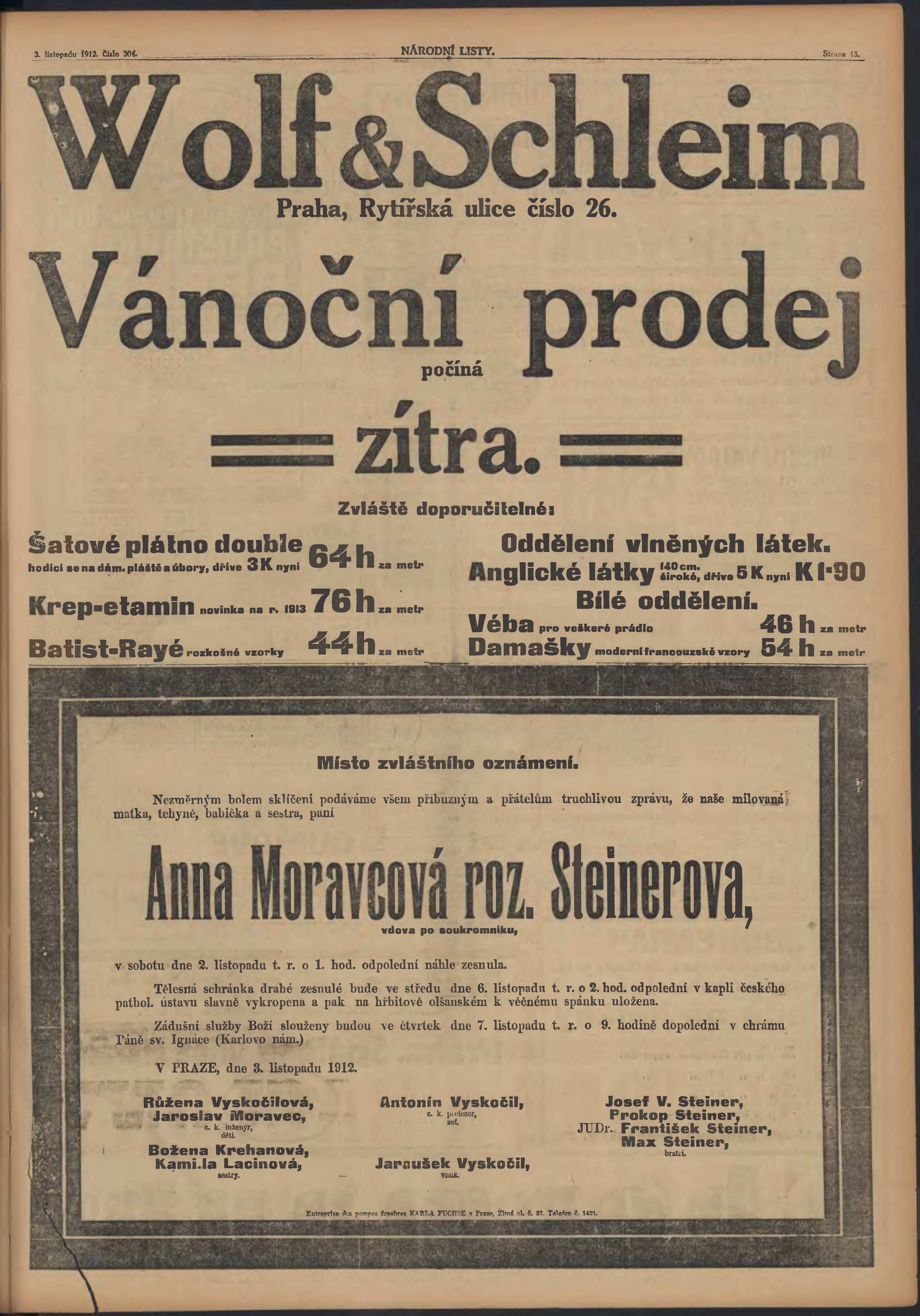 * Datum vydání výtisku: 3.11.1912 Číslo výtisku: 304 Poznámky k výtisku: ranní vydání;