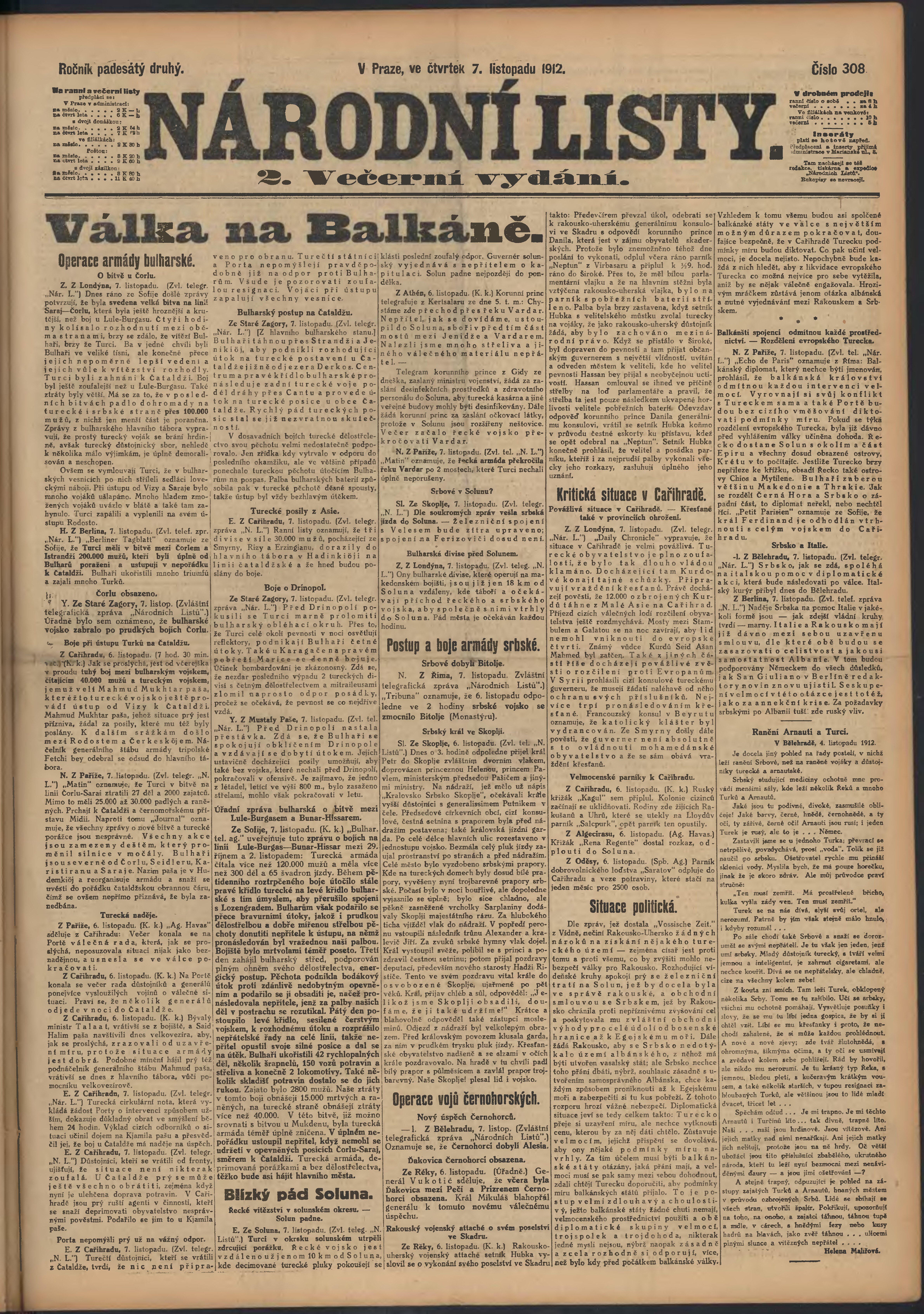 * Datum vydání výtisku: 7.11.1912 Číslo výtisku: 308 Poznámky k výtisku: 2. večerní vydání;