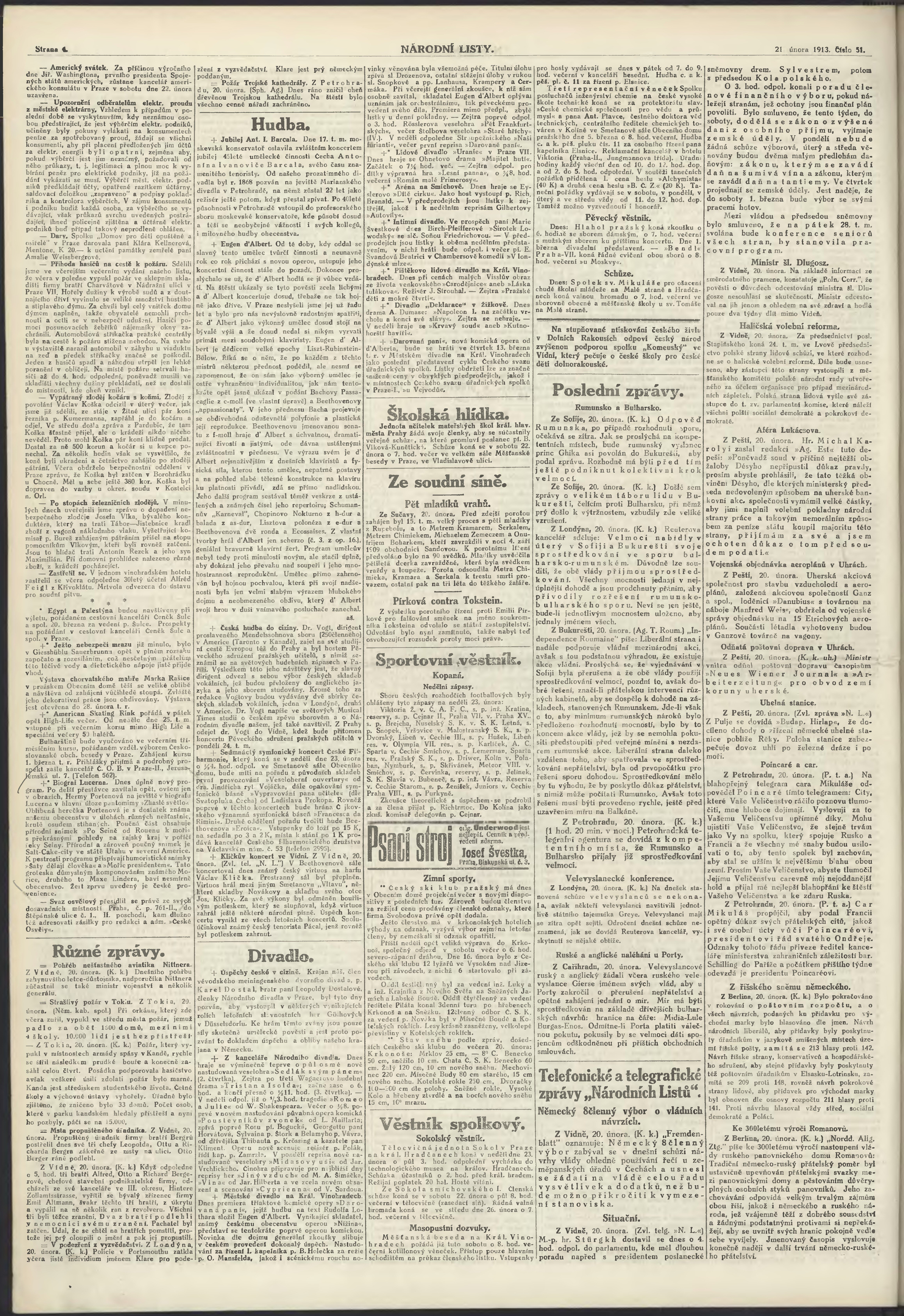 * Datum vydání výtisku: 21.2.1913 Číslo výtisku: 51 Poznámky k výtisku: ranní vydání;