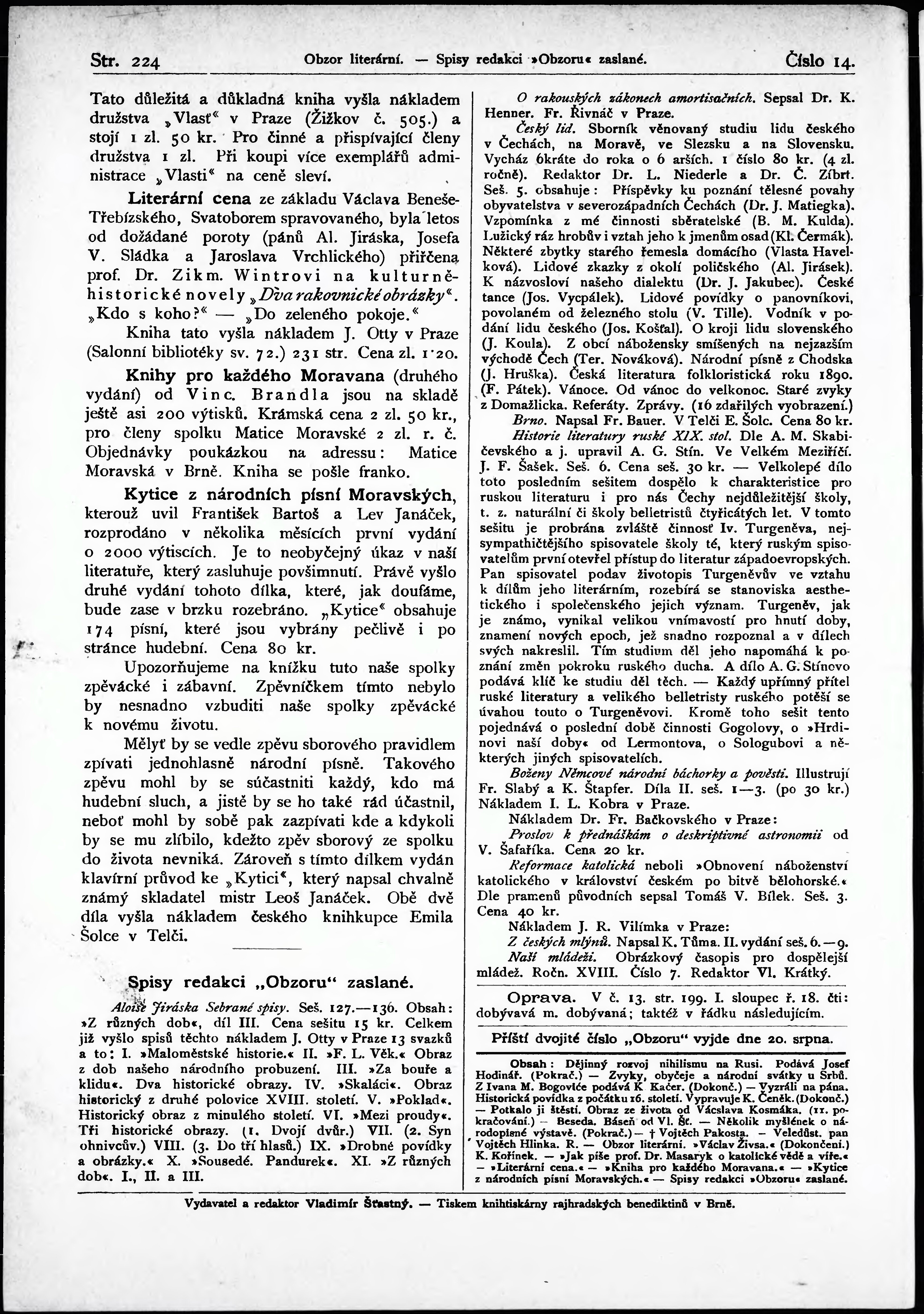 * Datum vydání výtisku: 20.7.1892 Číslo výtisku: 14