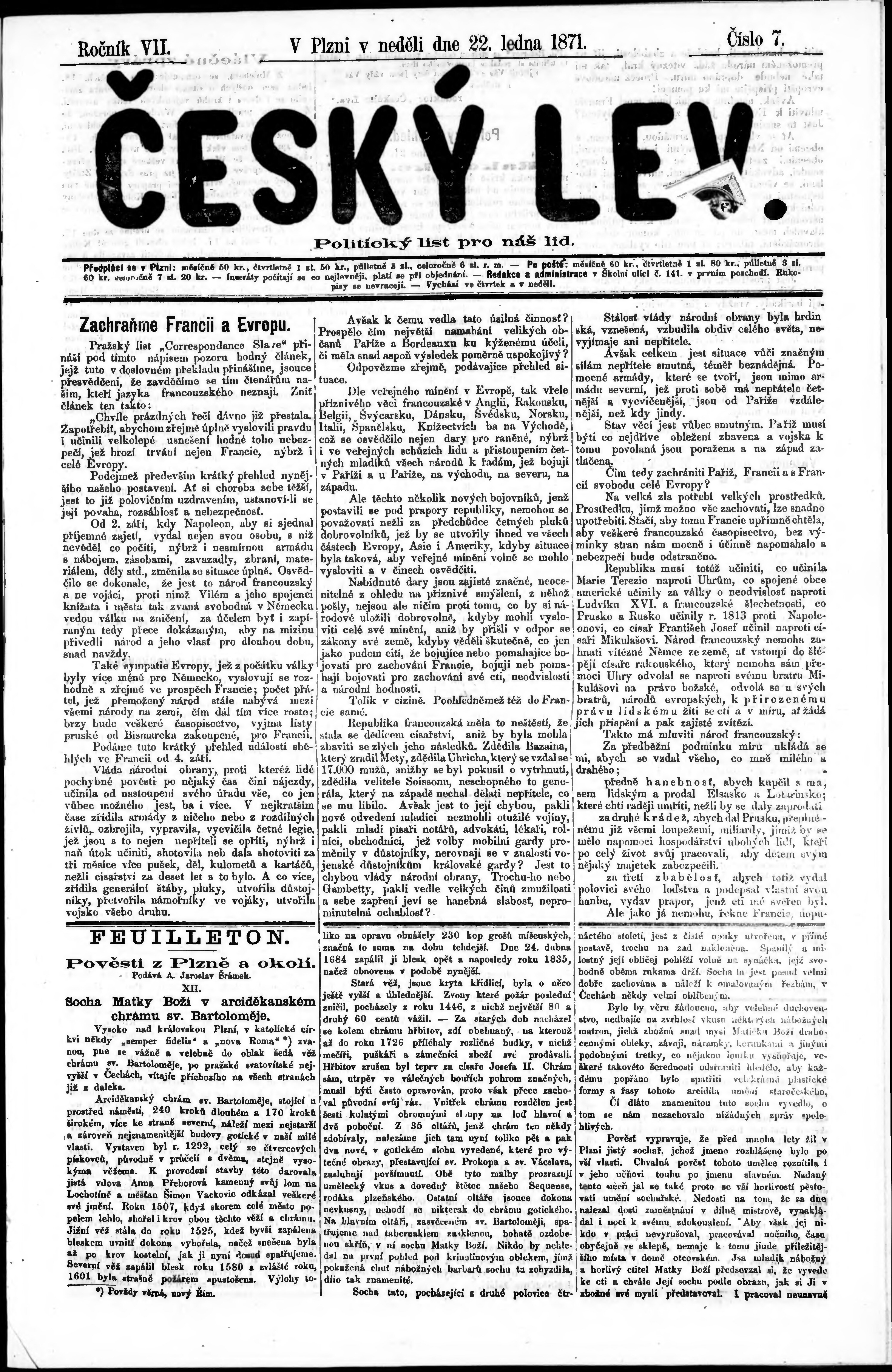* Datum vydání výtisku: 22.1.1871 Číslo výtisku: 7
