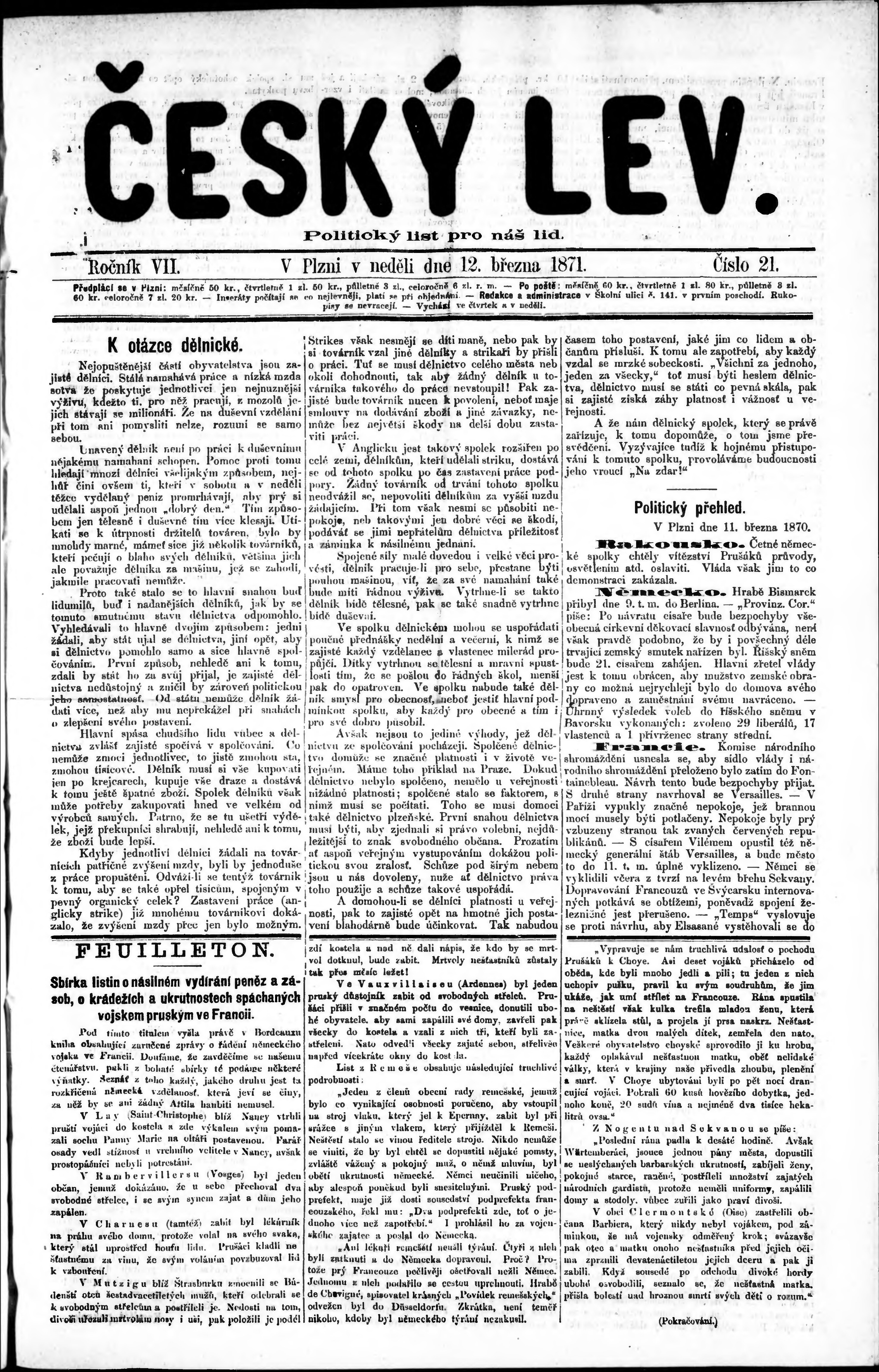 * Datum vydání výtisku: 12.3.1871 Číslo výtisku: 21