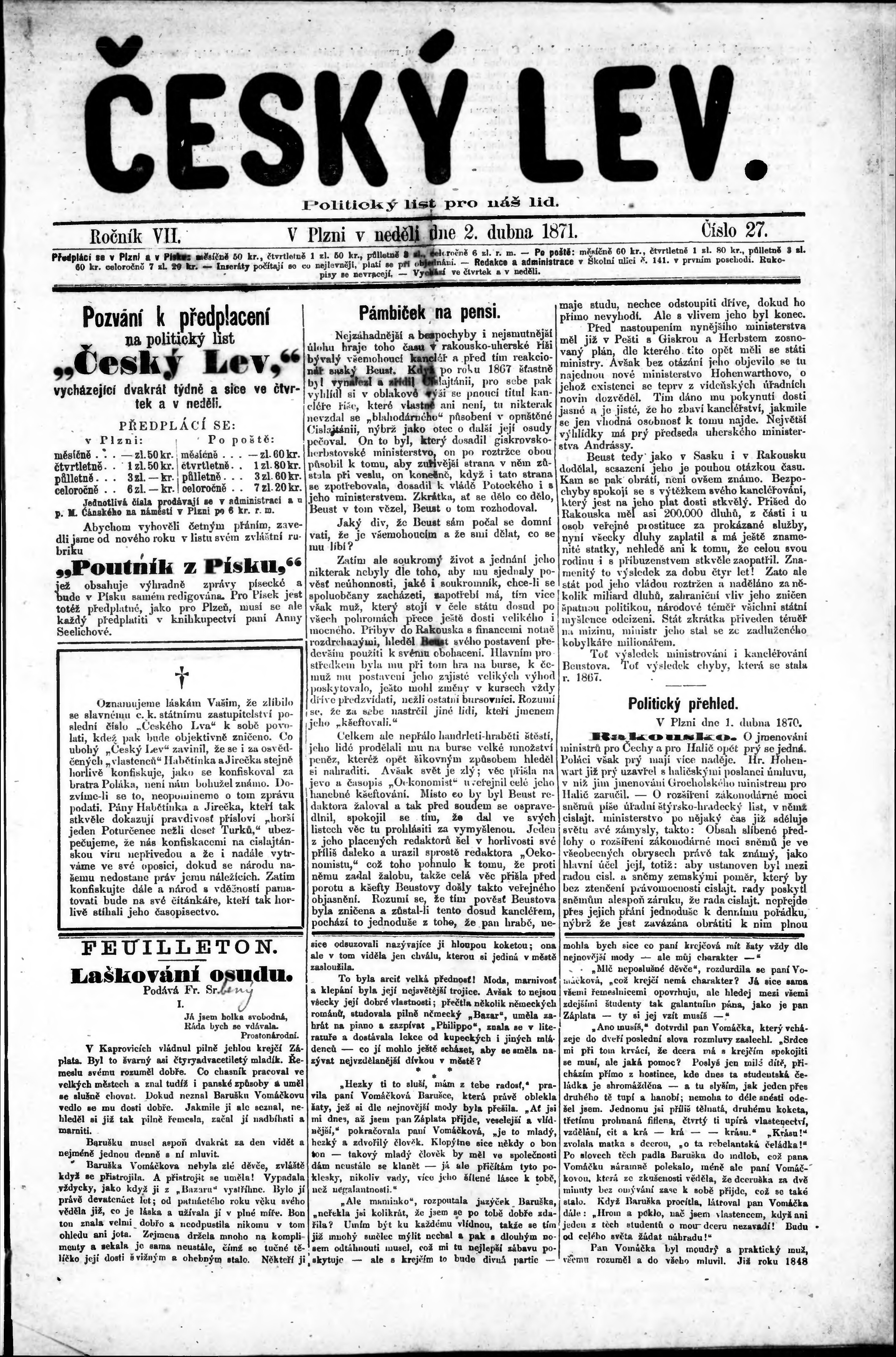 * Datum vydání výtisku: 2.4.1871 Číslo výtisku: 27