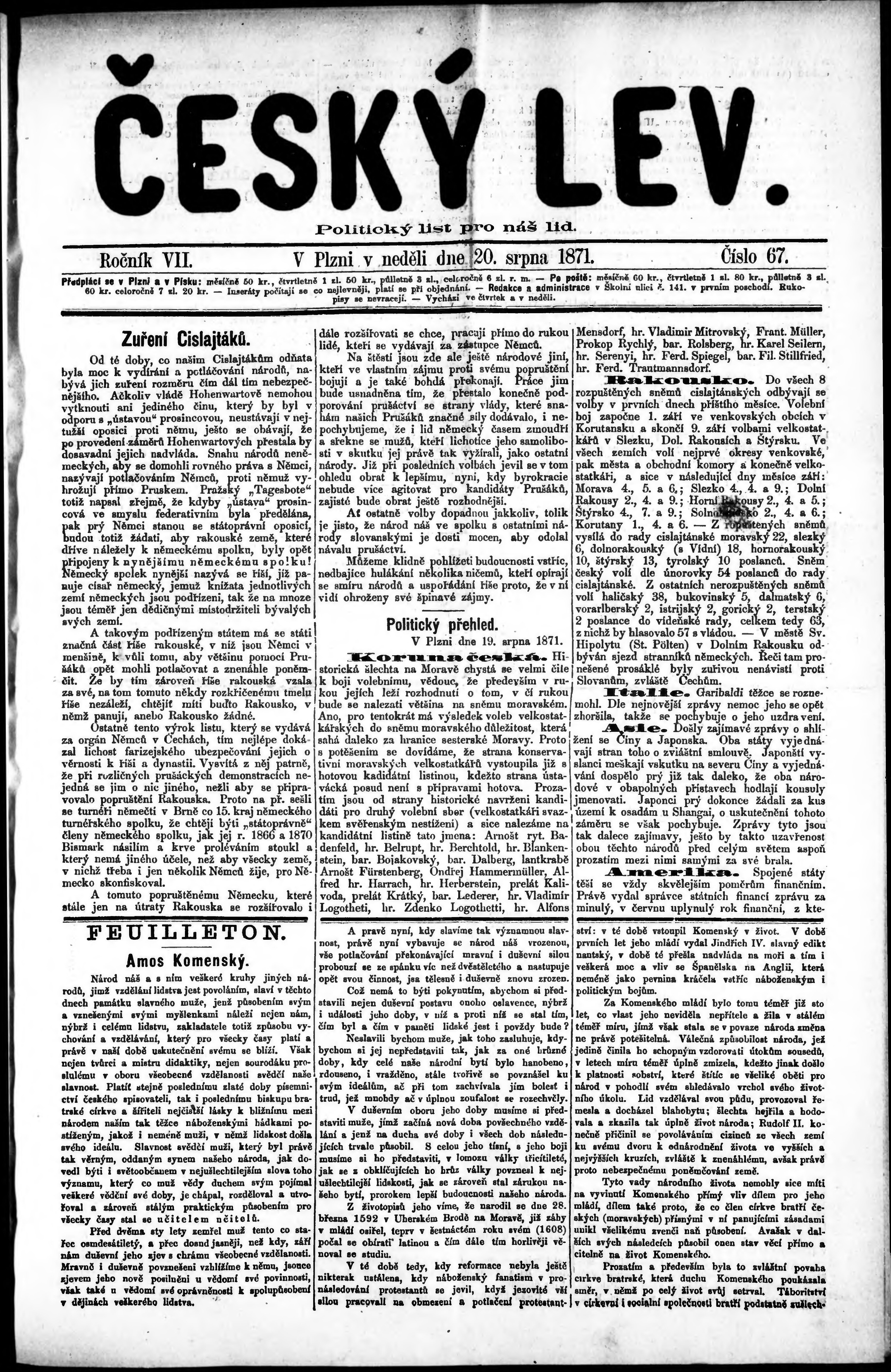 * Datum vydání výtisku: 20.8.1871 Číslo výtisku: 67
