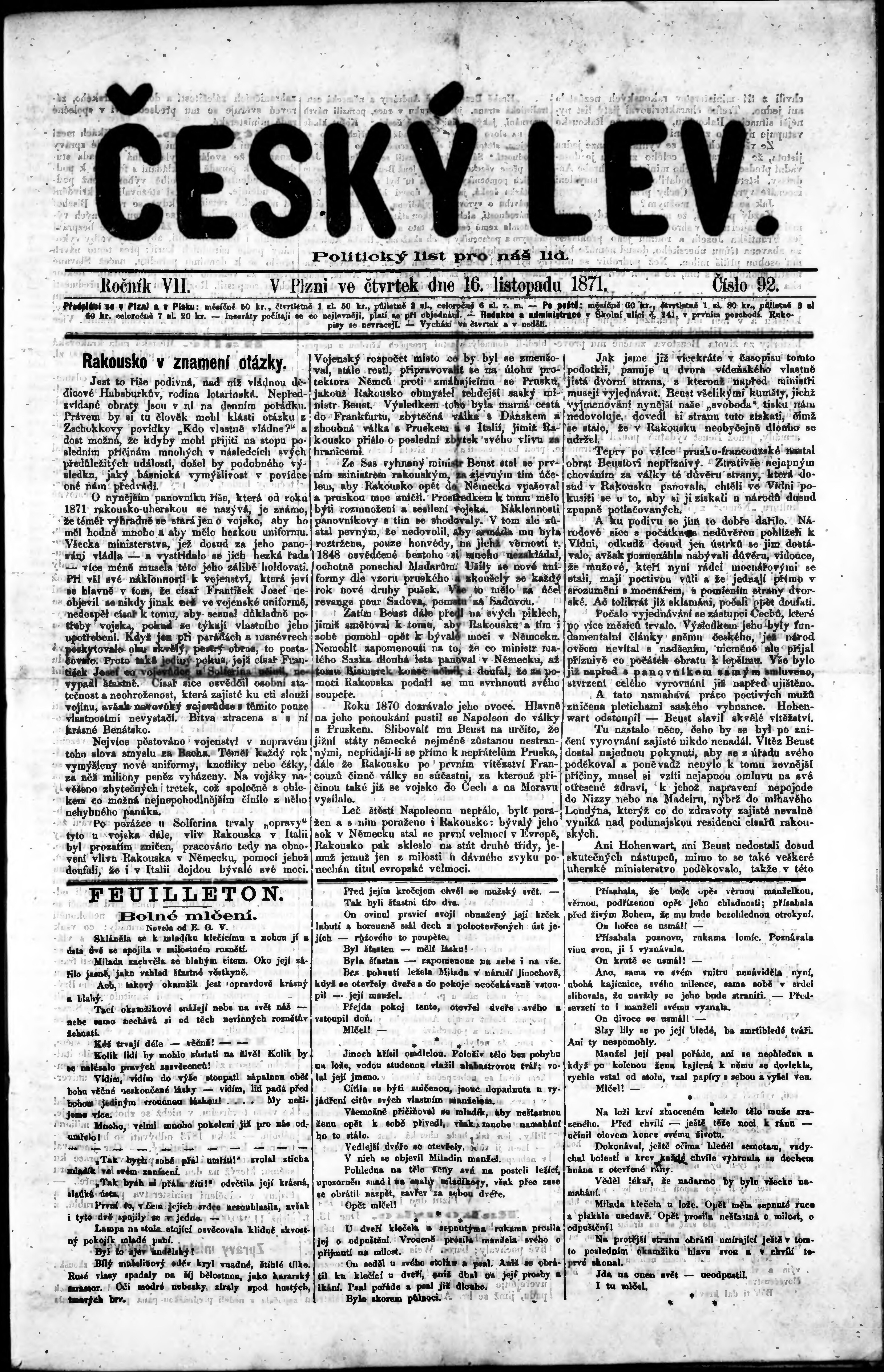 * Datum vydání výtisku: 16.11.1871 Číslo výtisku: 92