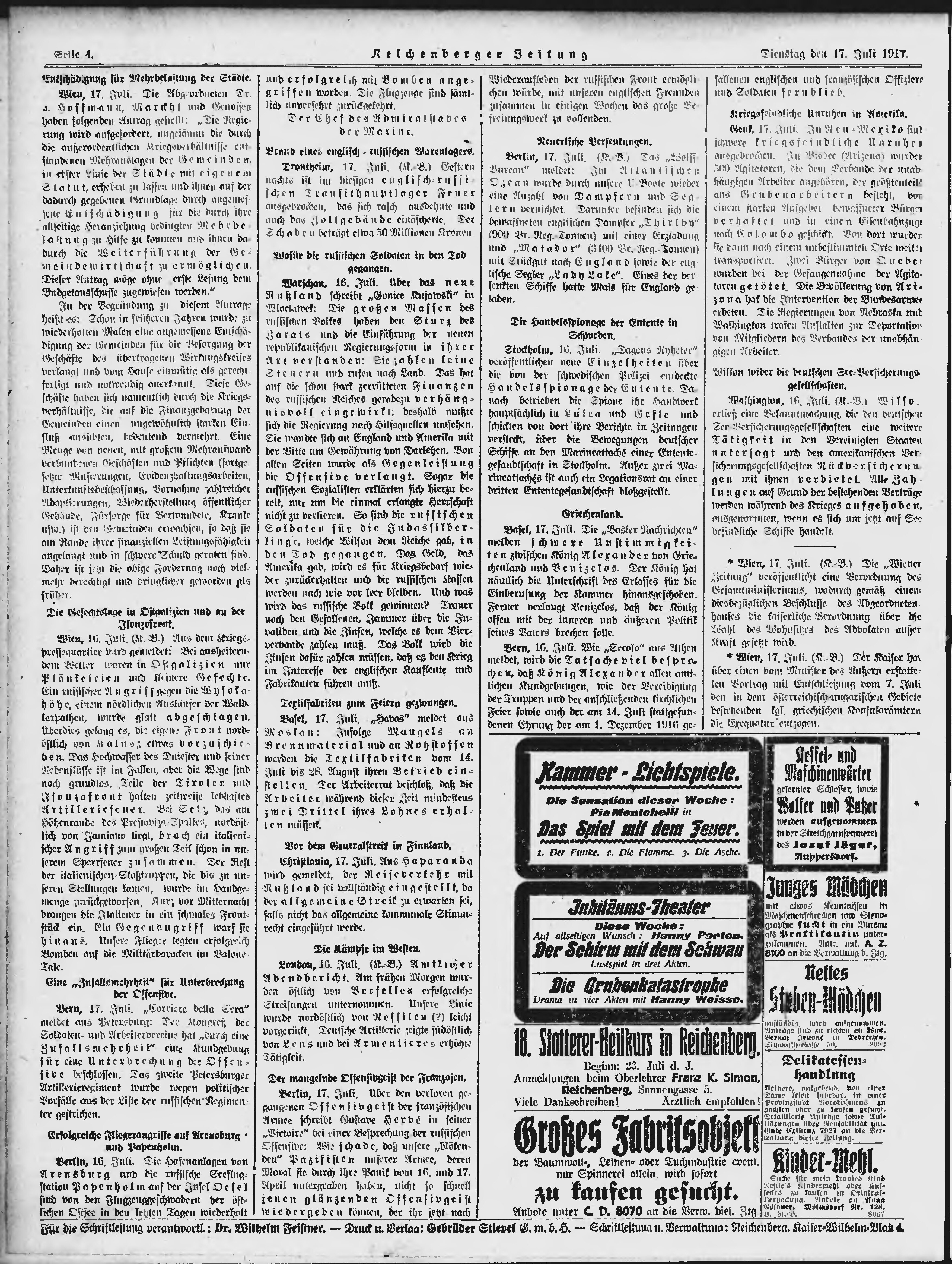 * Datum vydání výtisku: 17.7.1917 Číslo výtisku: 170 Typ výtisku: příloha Poznámky k výtisku: večerní vydání;