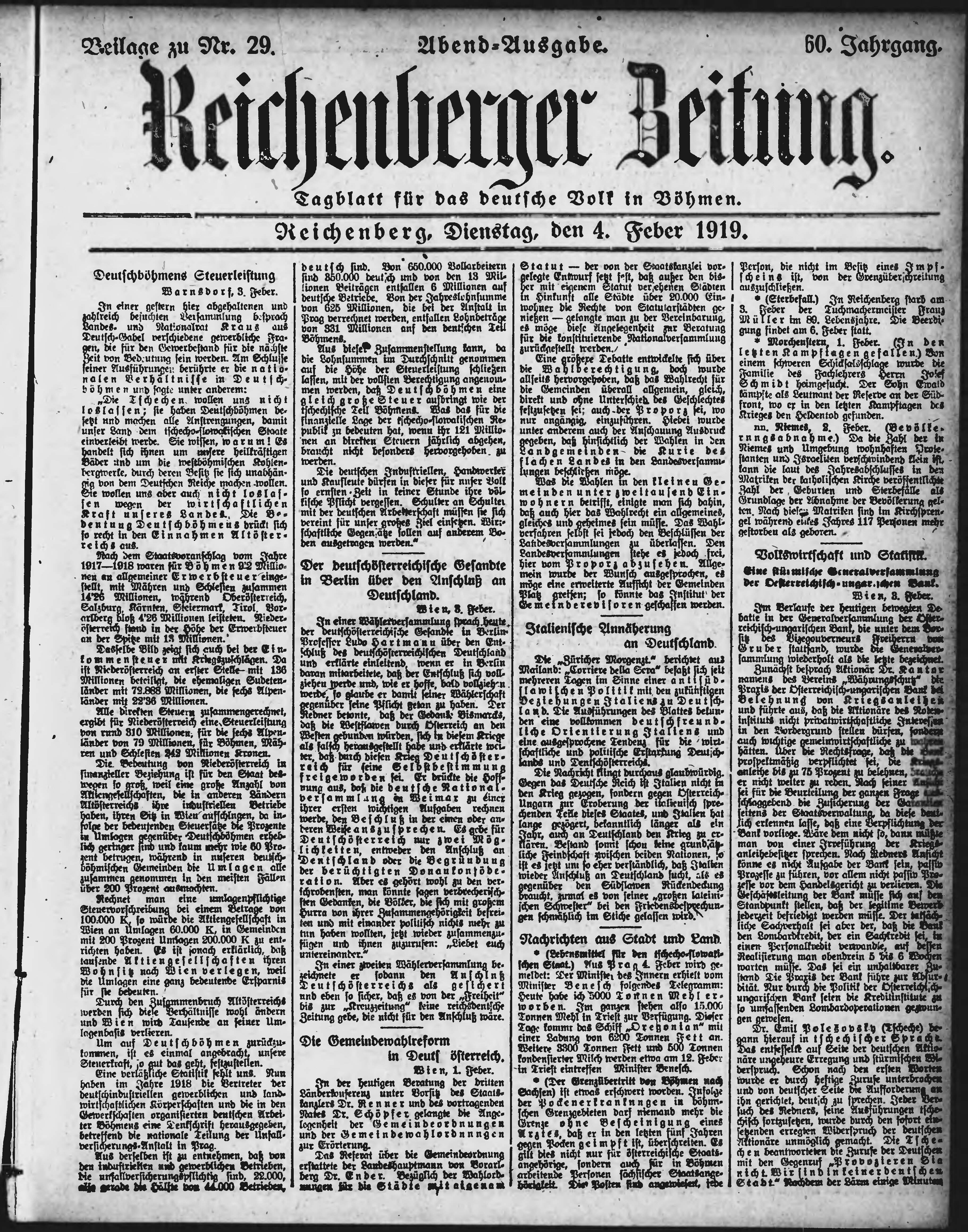 * Datum vydání výtisku: 4.2.1919 Číslo výtisku: 29 Typ výtisku: příloha Poznámky k výtisku: večerní vydání;