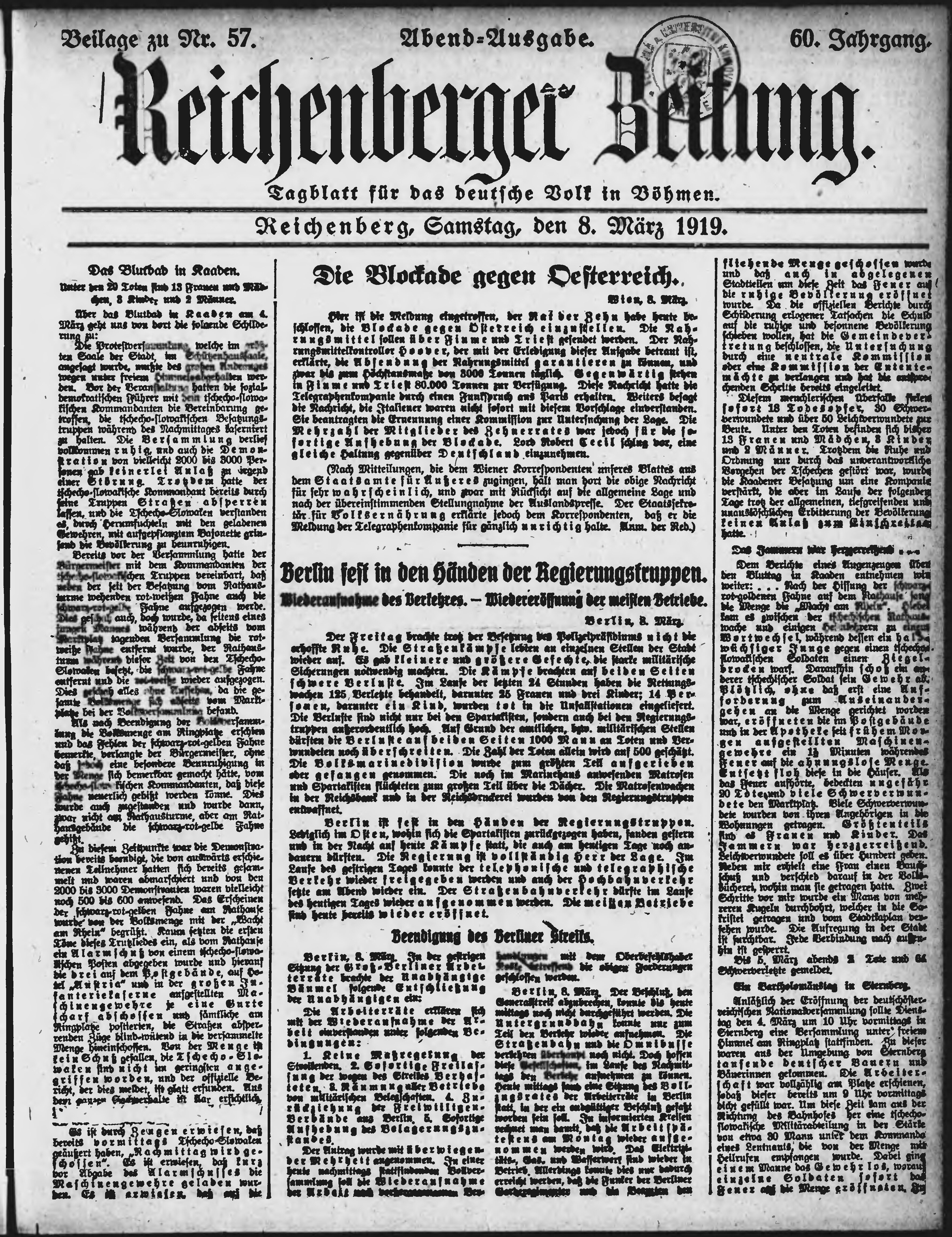 * Datum vydání výtisku: 8.3.1919 Číslo výtisku: 57 Typ výtisku: příloha Poznámky k výtisku: večerní vydání;