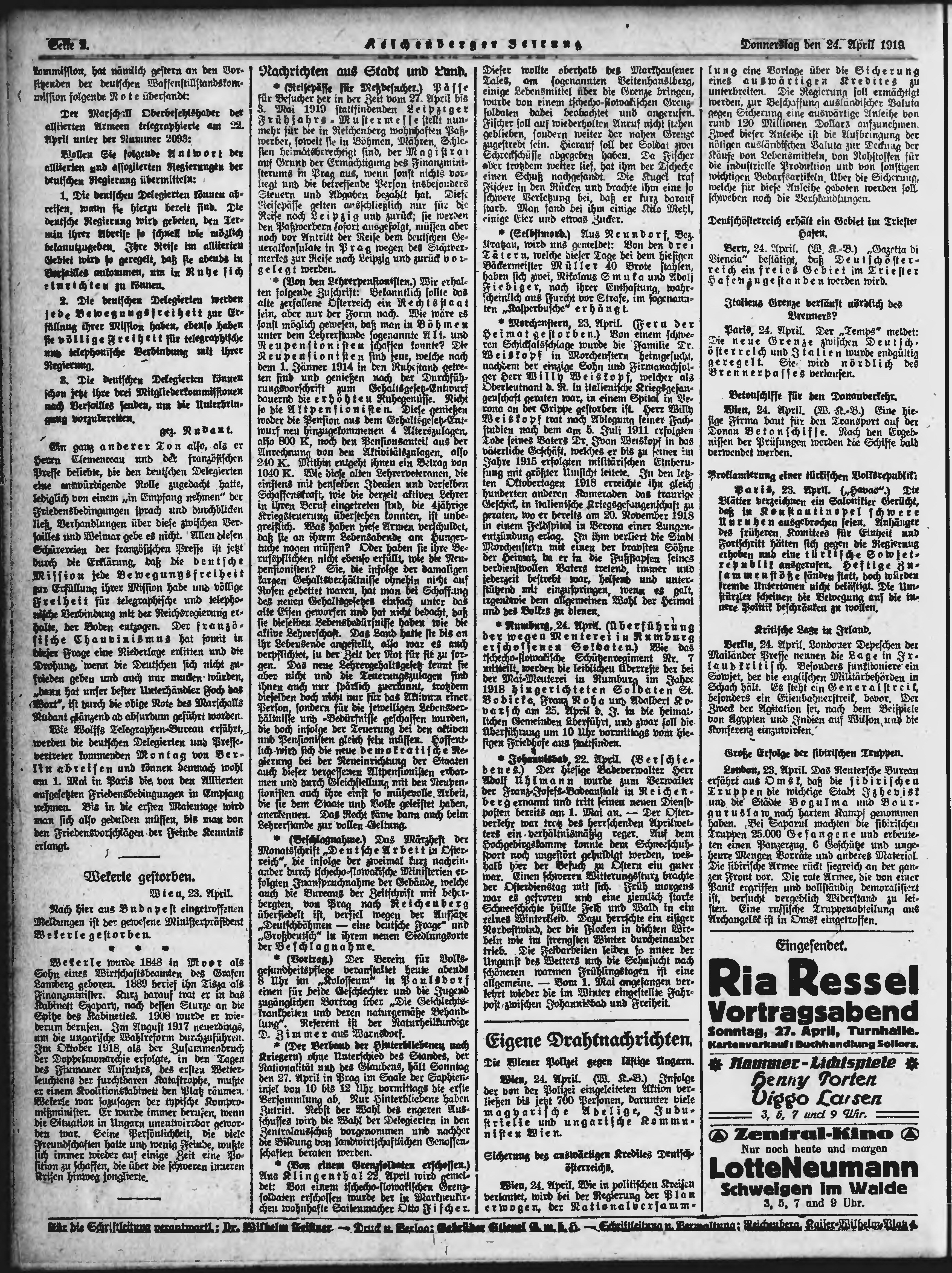 * Datum vydání výtisku: 24.4.1919 Číslo výtisku: 96 Typ výtisku: příloha Poznámky k výtisku: večerní vydání;