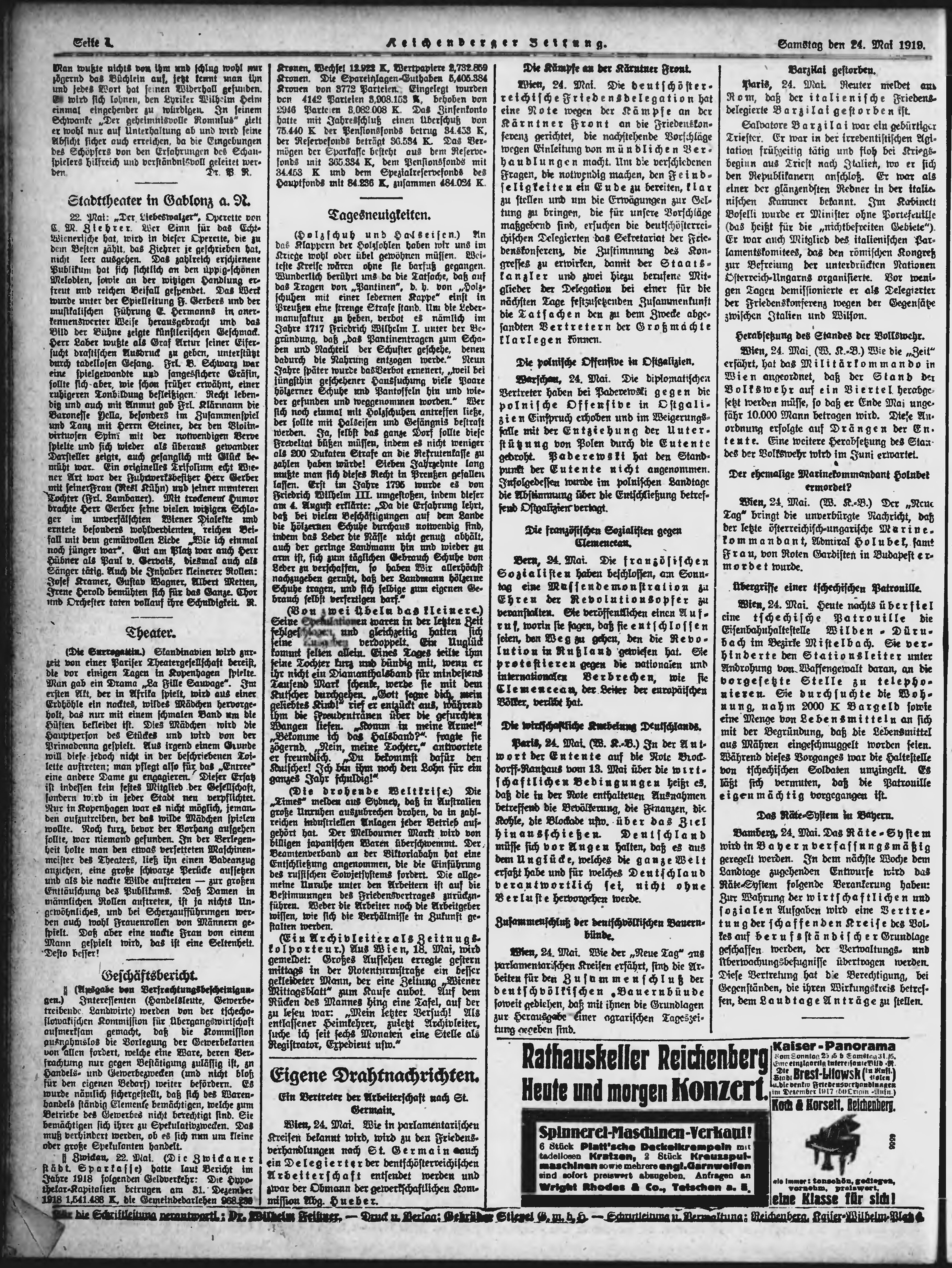 * Datum vydání výtisku: 24.5.1919 Číslo výtisku: 121 Typ výtisku: příloha Poznámky k výtisku: večerní vydání;