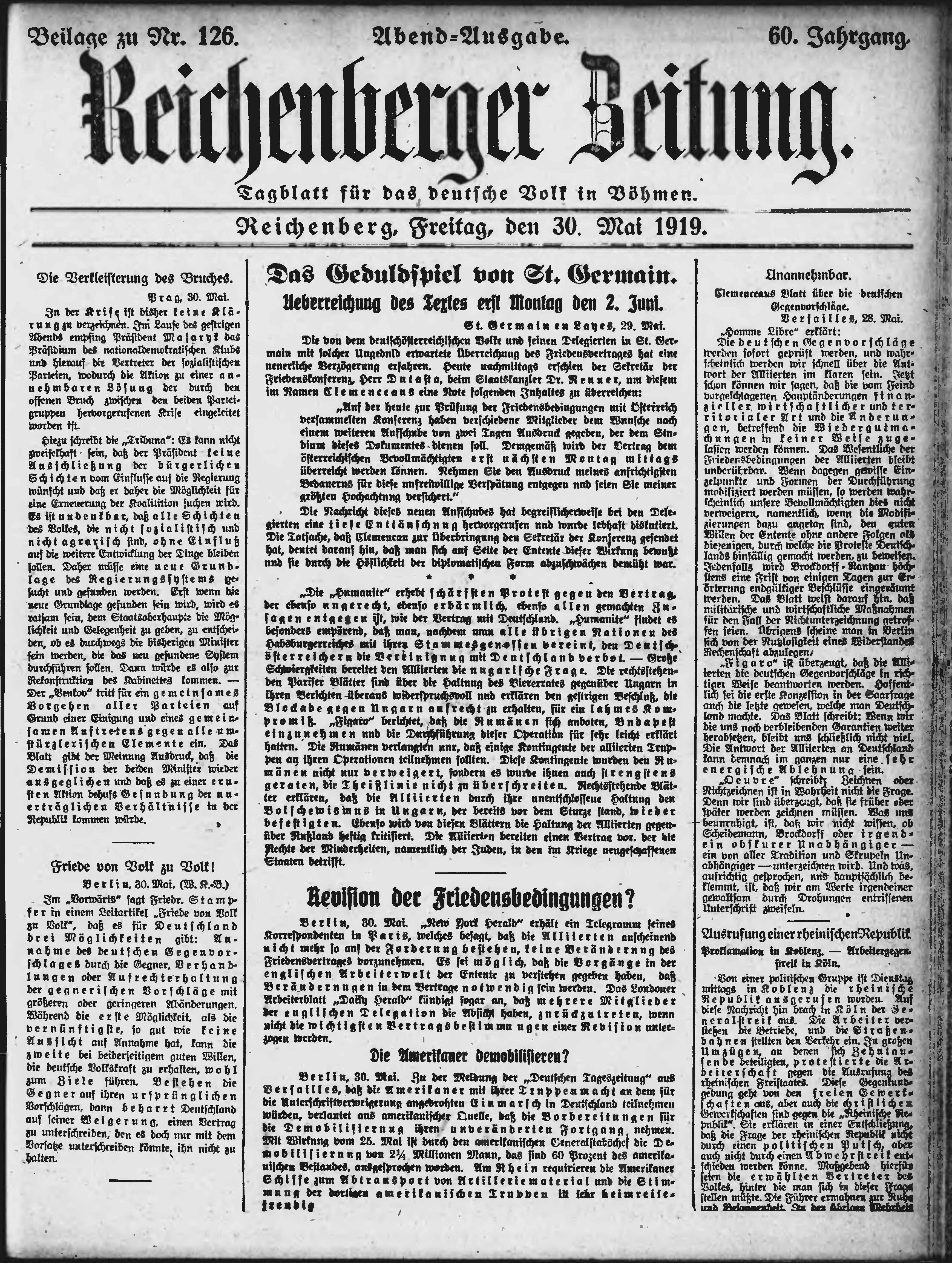 * Datum vydání výtisku: 30.5.1919 Číslo výtisku: 126 Typ výtisku: příloha Poznámky k výtisku: večerní vydání;