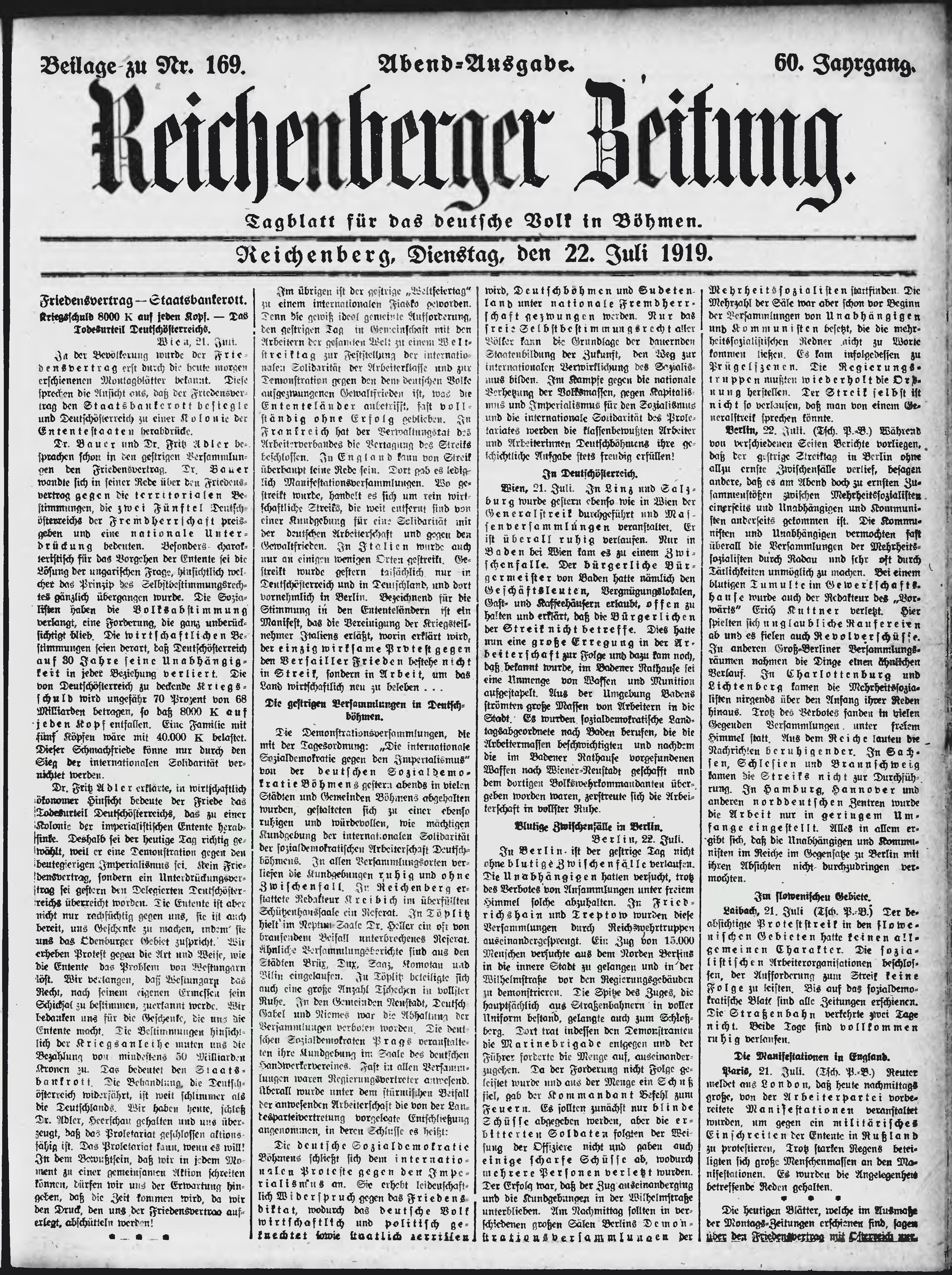 * Datum vydání výtisku: 22.7.1919 Číslo výtisku: 169 Typ výtisku: příloha Poznámky k výtisku: večerní vydání;