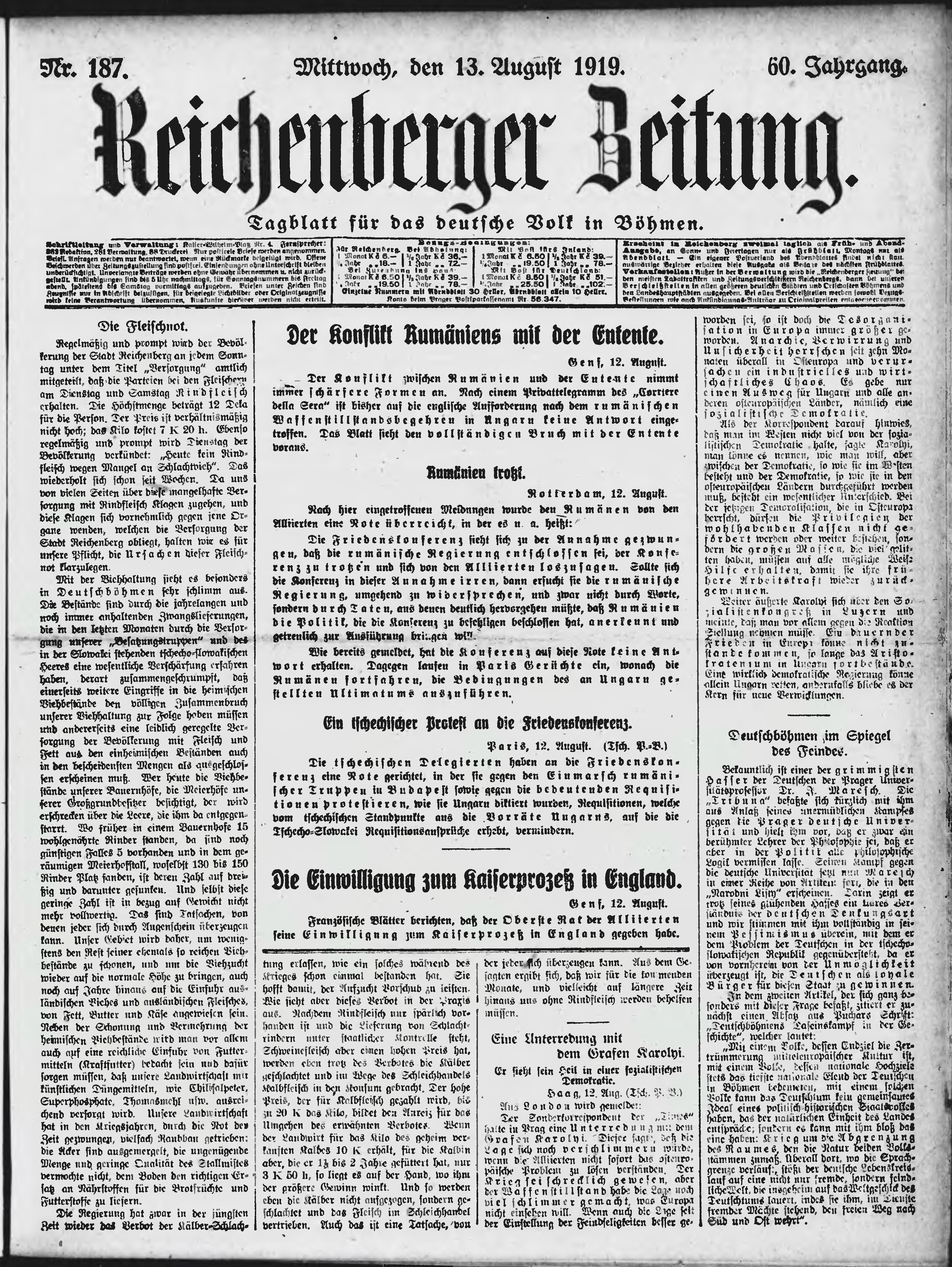 * Datum vydání výtisku: 13.8.1919 Číslo výtisku: 187 Poznámky k výtisku: ranní vydání;