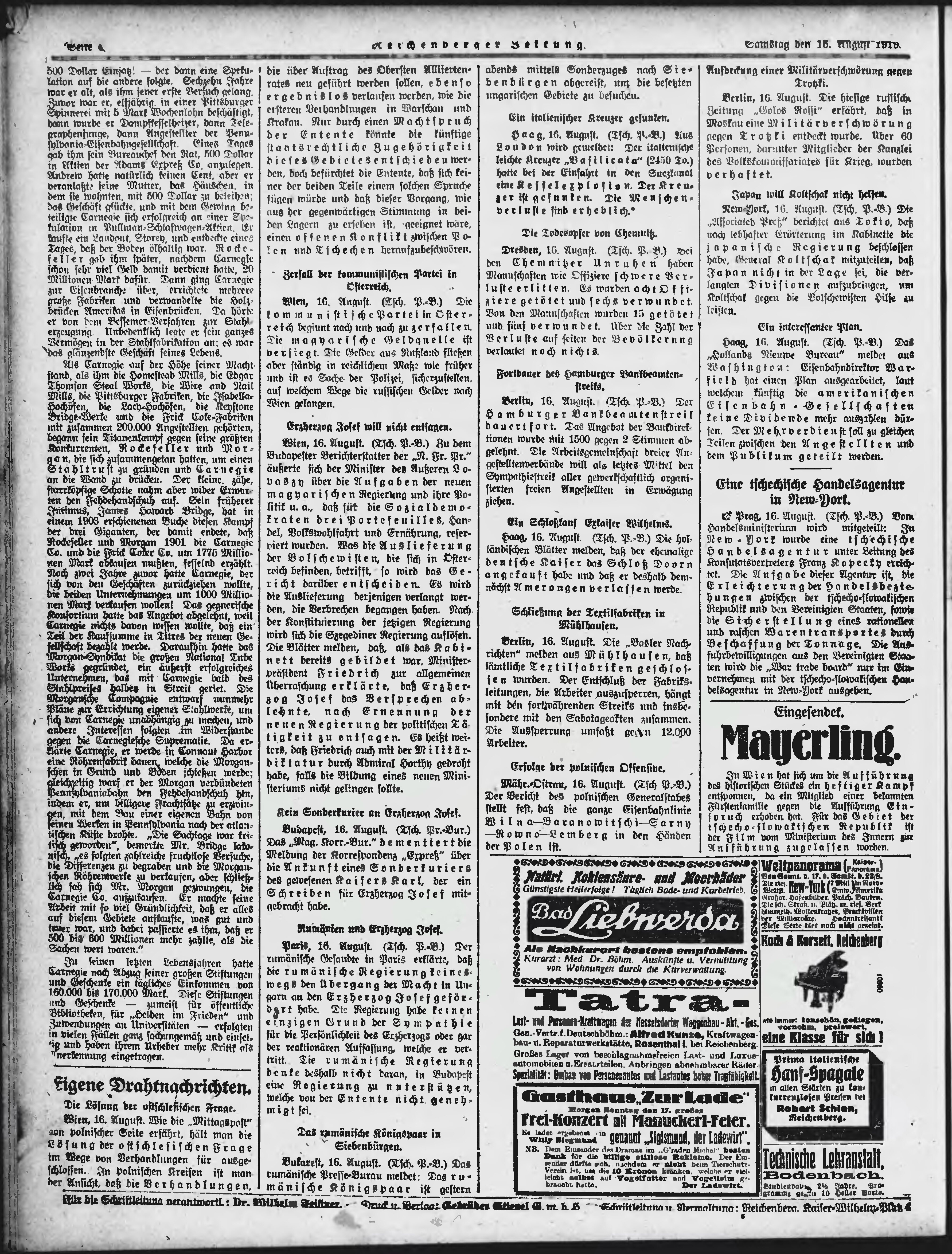 * Datum vydání výtisku: 16.8.1919 Číslo výtisku: 191 Typ výtisku: příloha Poznámky k výtisku: večerní vydání;