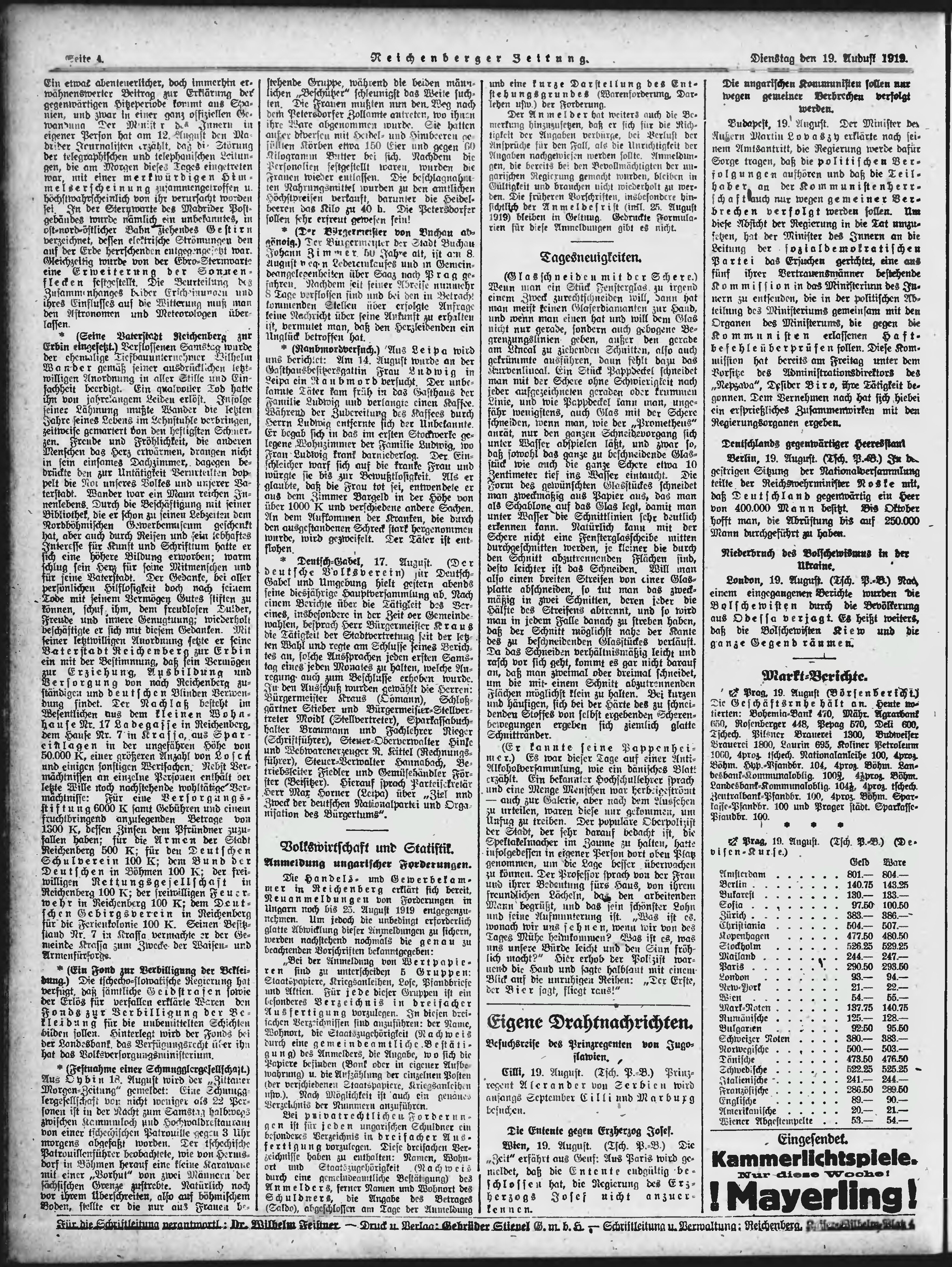 * Datum vydání výtisku: 19.8.1919 Číslo výtisku: 193 Typ výtisku: příloha Poznámky k výtisku: večerní vydání;