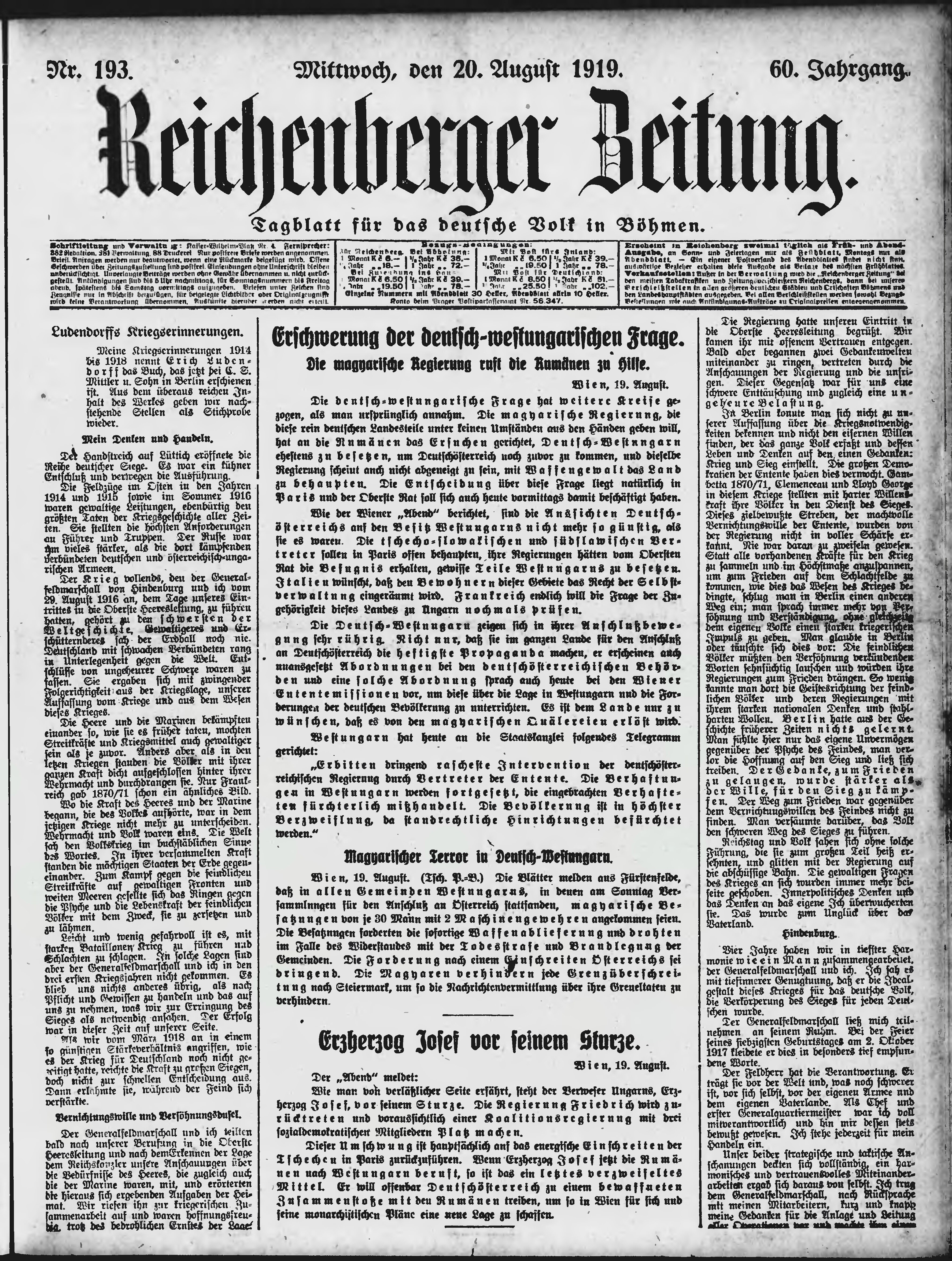 * Datum vydání výtisku: 20.8.1919 Číslo výtisku: 193 Poznámky k výtisku: ranní vydání;