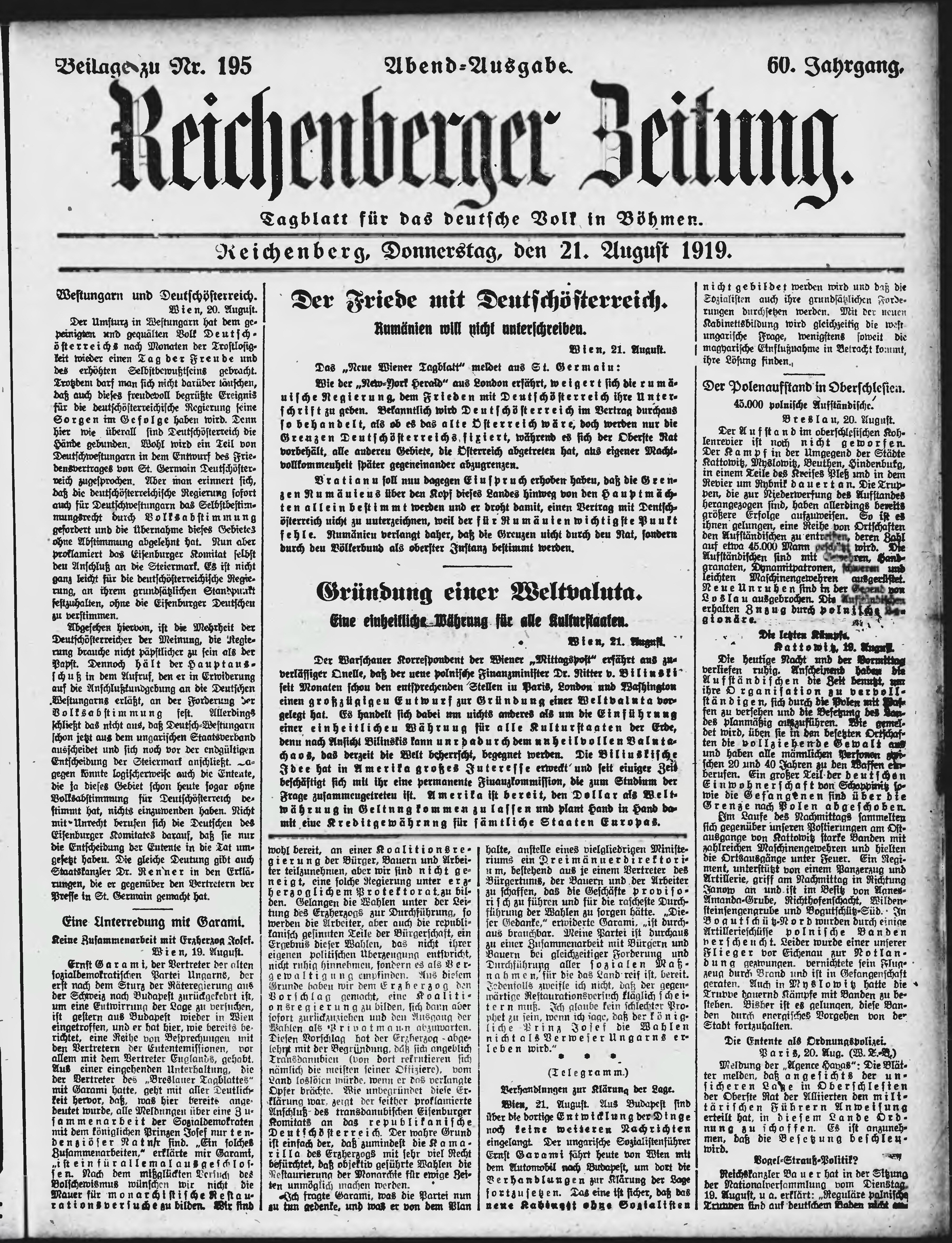 * Datum vydání výtisku: 21.8.1919 Číslo výtisku: 195 Typ výtisku: příloha Poznámky k výtisku: večerní vydání;