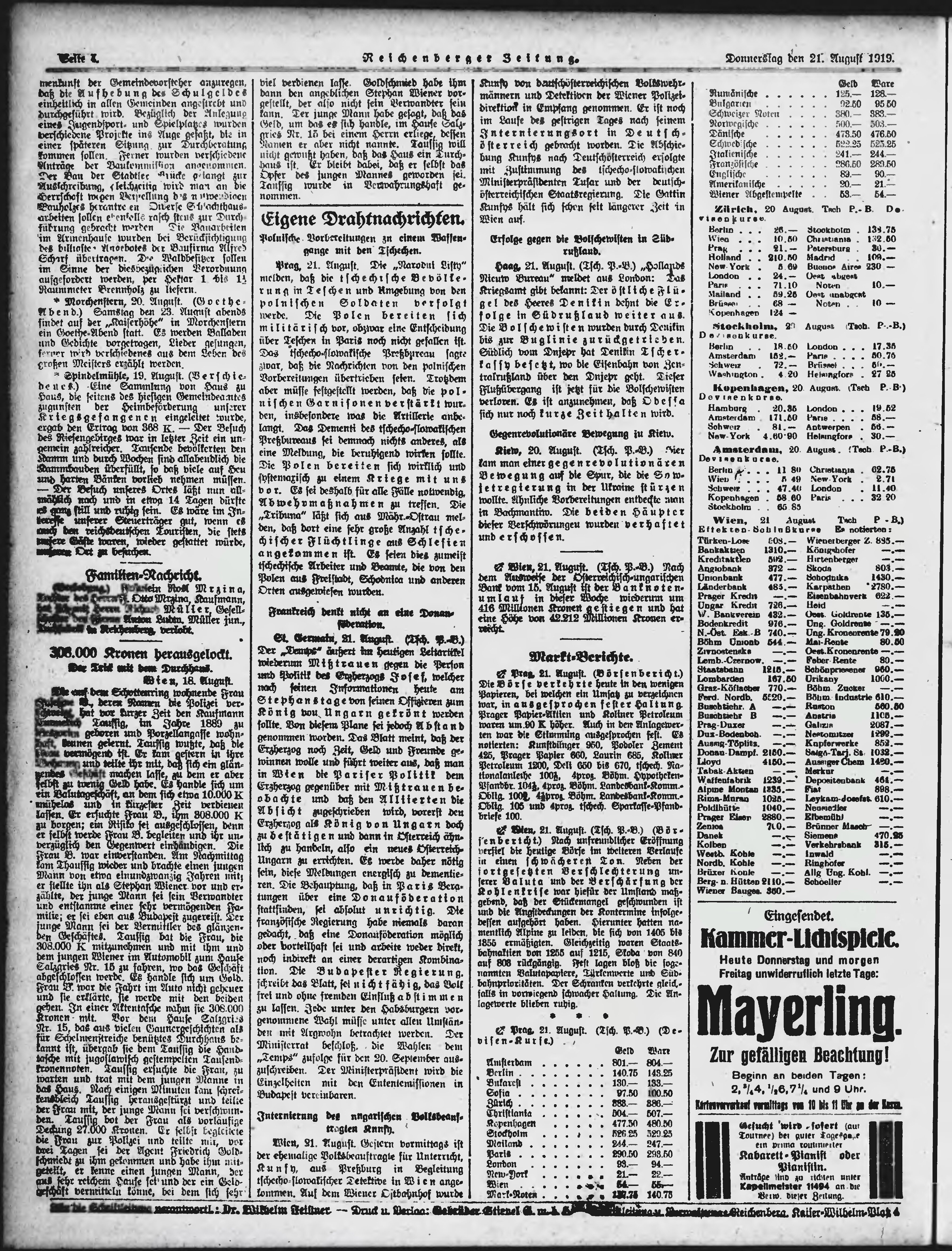 * Datum vydání výtisku: 21.8.1919 Číslo výtisku: 195 Typ výtisku: příloha Poznámky k výtisku: večerní vydání;