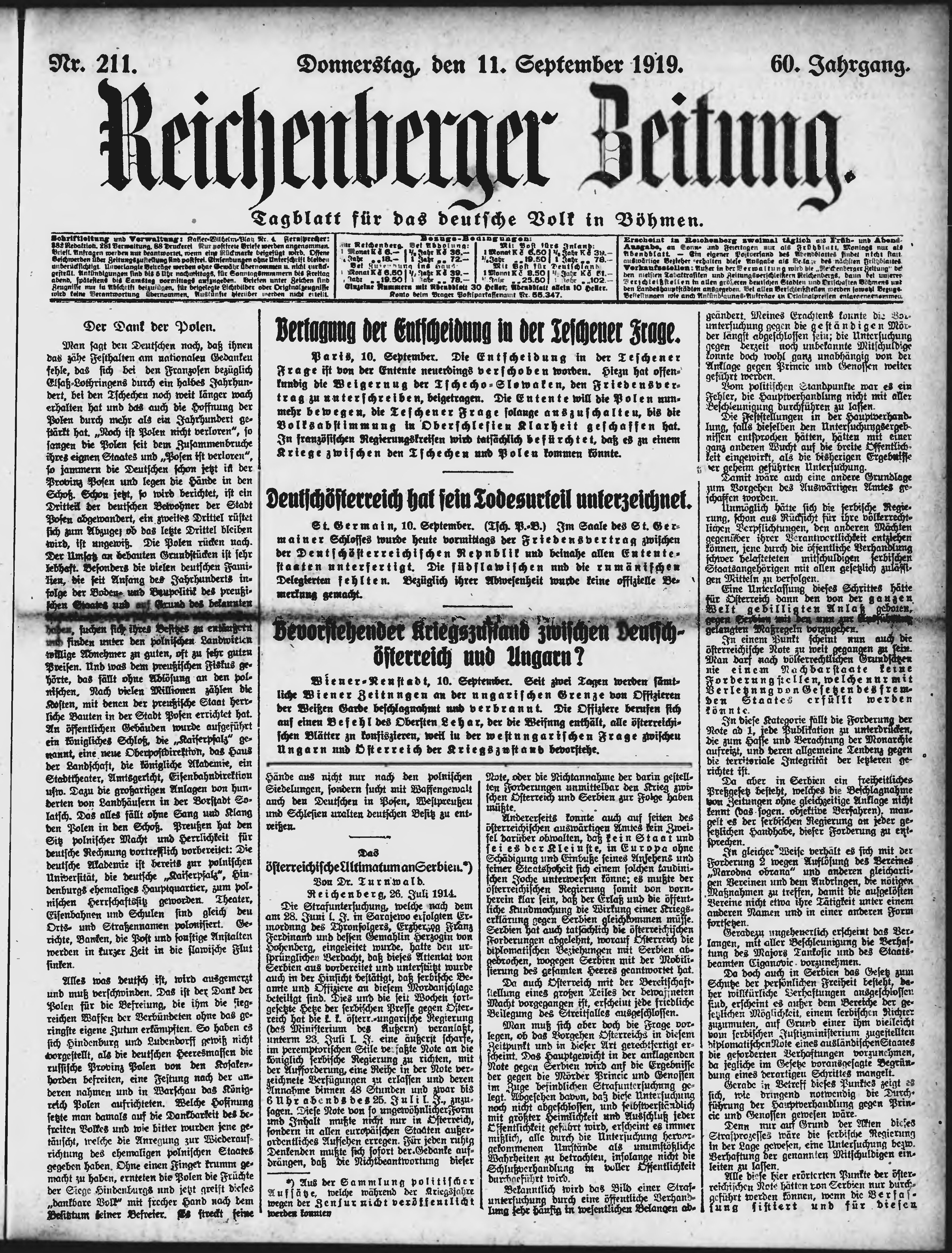 * Datum vydání výtisku: 11.9.1919 Číslo výtisku: 211 Poznámky k výtisku: ranní vydání;