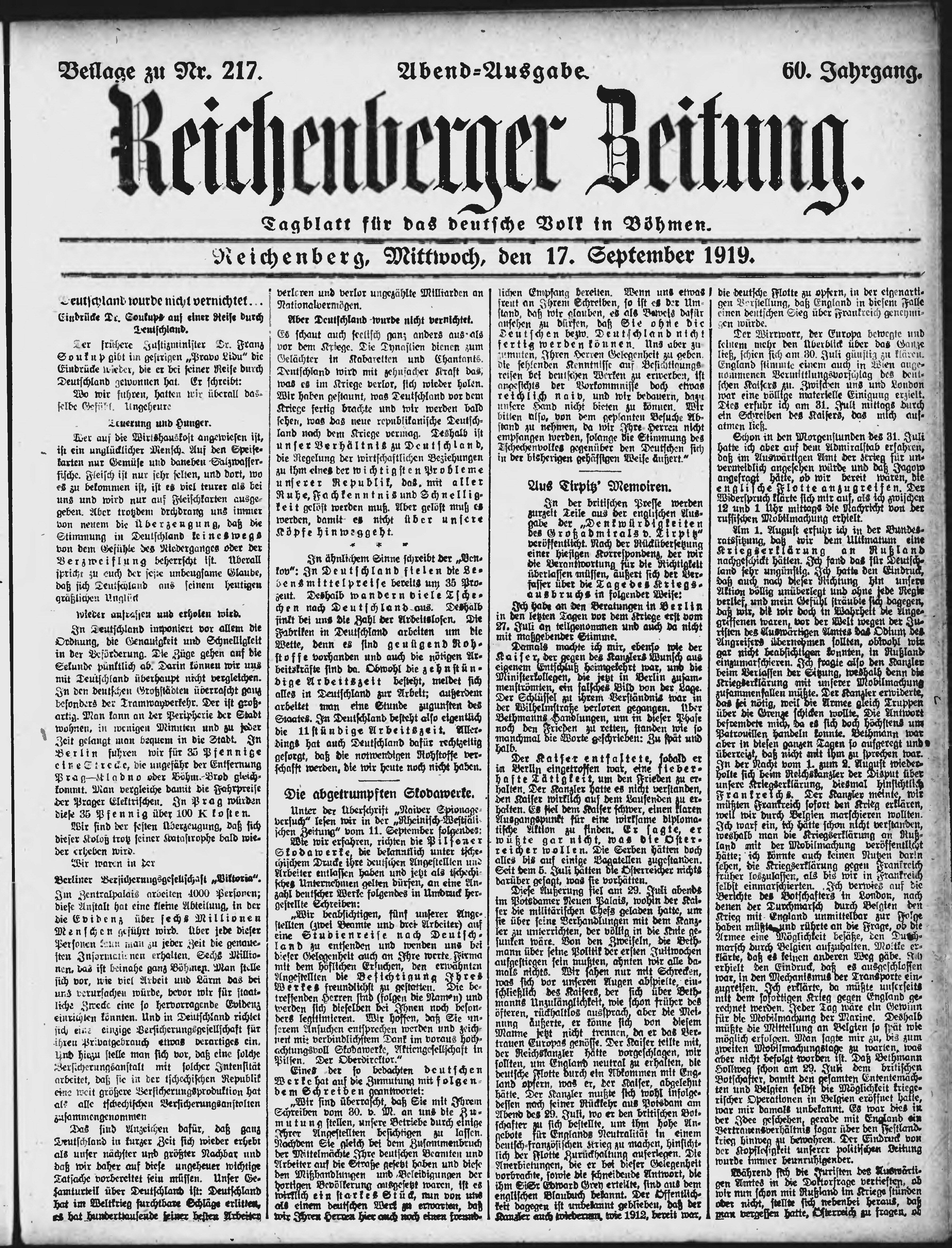 * Datum vydání výtisku: 17.9.1919 Číslo výtisku: 217 Typ výtisku: příloha Poznámky k výtisku: večerní vydání;