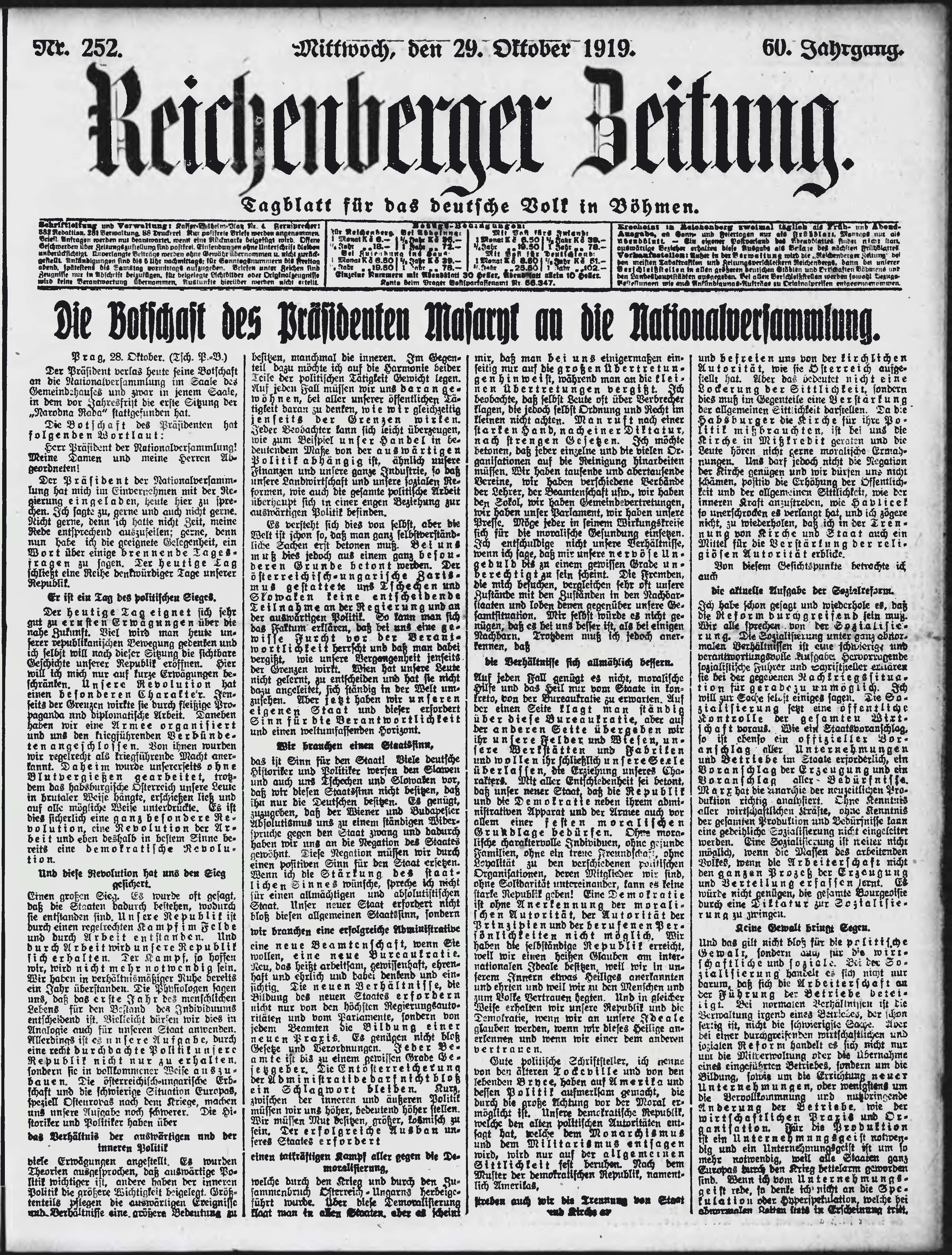 * Datum vydání výtisku: 29.10.1919 Číslo výtisku: 252 Poznámky k výtisku: ranní vydání;